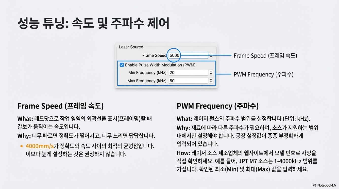 이 설정을 올바르게 해야만 레이저 소스가 제공하는 전체 주파수 범위를 활용할 수 있습니다. 잘못된 값은 특정 주파수 대역을 사용하지 못하게 만들어, 다양한 재료에 대한 최적의 마킹 조건을 찾는 데 제약을 줍니다. 정확한 주파수 범위를 설정하는 것은 레이저의 성능을 100% 끌어내기 위한 필수 과정입니다.