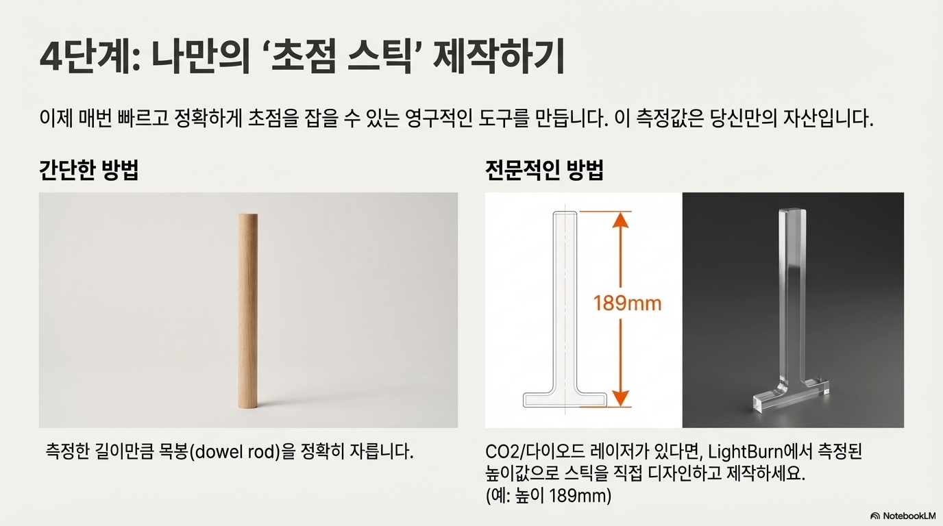 측정된 길이와 정확히 일치하는 나무 막대를 자르거나, 아크릴 조각을 레이저로 재단하여 초점 스틱을 만들 수 있습니다. 이 도구만 있으면 매번 복잡한 테스트 없이 스틱을 렌즈와 재료 사이에 대보는 것만으로도 몇 초 만에 완벽한 초점을 반복해서 맞출 수 있습니다.