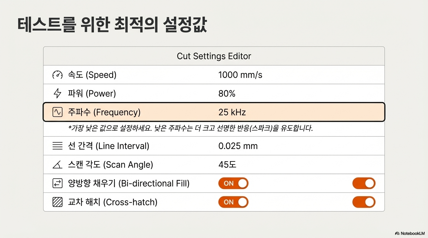 CO2 갈보 레이저의 경우, 다른 접근법이 필요합니다. 넓은 선 간격(예: 2mm)으로 평행선을 여러 개 각인하는 테스트를 진행하세요. 그 다음, 초점을 조절하면서 이 선들이 최대한 가늘고 선명해지는 지점을 찾아야 합니다. 만약 선이 굵고 번진 것처럼 보인다면, 초점이 맞지 않았다는 신호입니다.