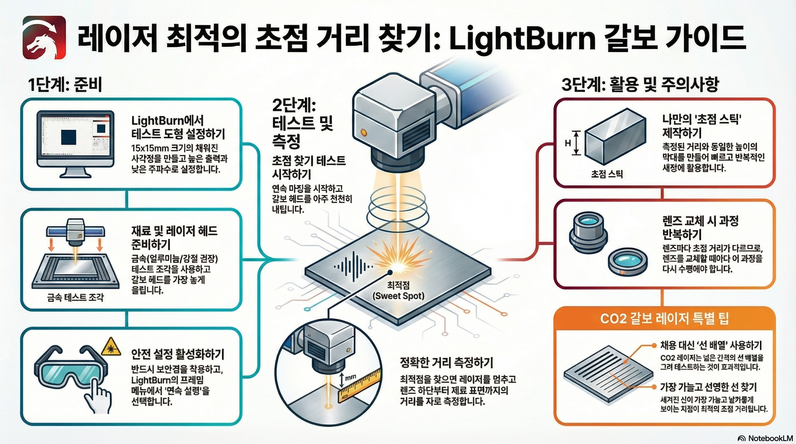 파이버 레이저의 최적 초점을 찾는 과정은 직관과 조금 다를 수 있습니다. 핵심은 각인된 자국을 눈으로만 판단하는 것이 아니라, 레이저가 재료에 반응할 때 나는 소리와 빛에 집중하는 것입니다.