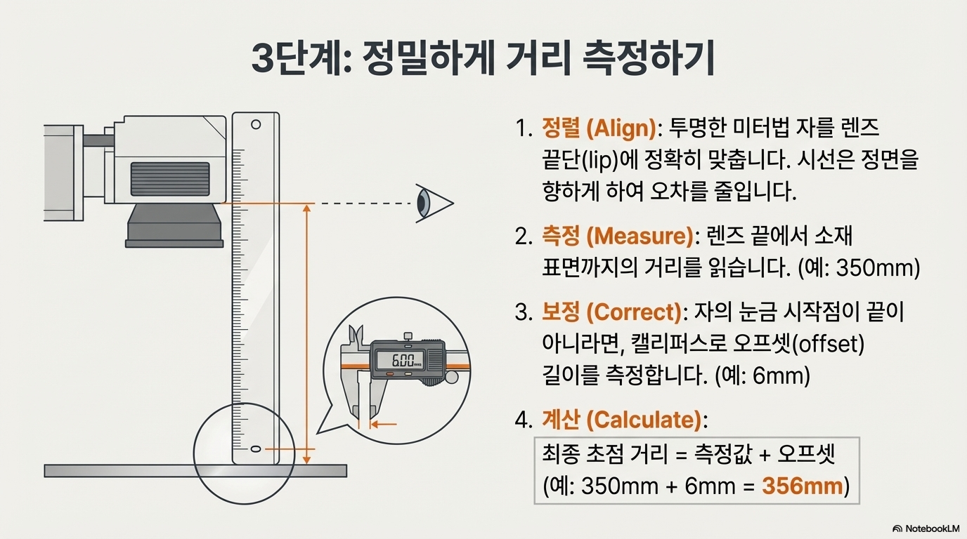 마침내 최적의 초점 거리를 찾았다면, 매번 이 과정을 반복할 필요는 없습니다. 렌즈 끝에서 재료 표면까지의 정확한 거리를 측정하여 나만의 '초점 스틱(focal stick)'을 만드세요. 전문가적인 방법은 투명 아크릴 자를 사용하여 렌즈 끝부분과 일치하는 눈금을 읽는 것입니다. 이때 대부분의 자는 바닥 끝과 0점 눈금 사이에 여백이 있으므로, 캘리퍼스를 사용해 이 여백의 길이를 정밀하게 측정한 후 처음 측정한 값에 더해주어야 진짜 초점 거리를 얻을 수 있습니다.