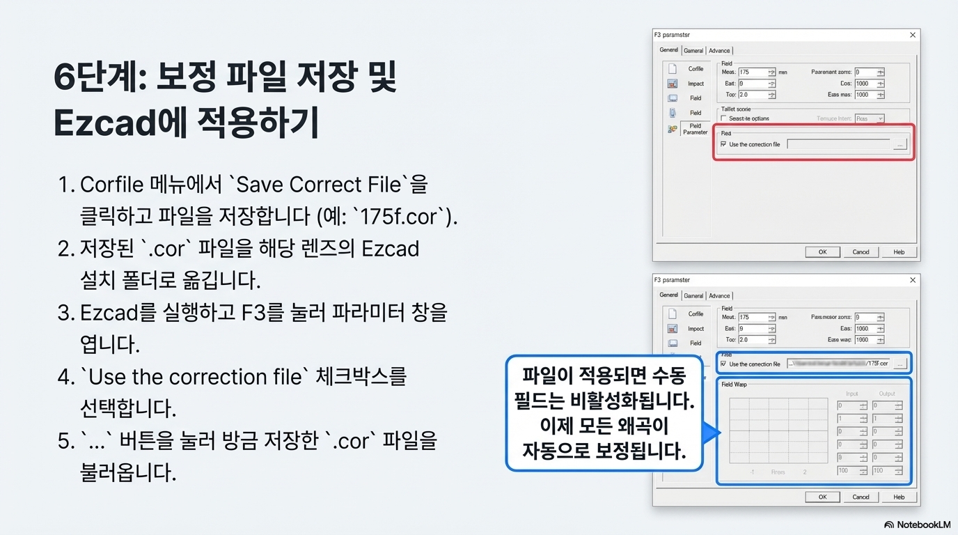 검증이 끝났다면, Ezcad F3 파라미터 메뉴에서 "Use the correction file(보정 파일 사용)" 옵션을 체크하고 저장한 파일을 선택하면 모든 과정이 끝납니다. 이때 주목해야 할 점은, 보정 파일을 불러오는 순간 기존의 모든 수동 보정 값 입력 칸들이 비활성화(회색으로 변함)된다는 것입니다. 이제부터 모든 복잡한 왜곡 보정 계산은 컴퓨터가 알아서 처리합니다.