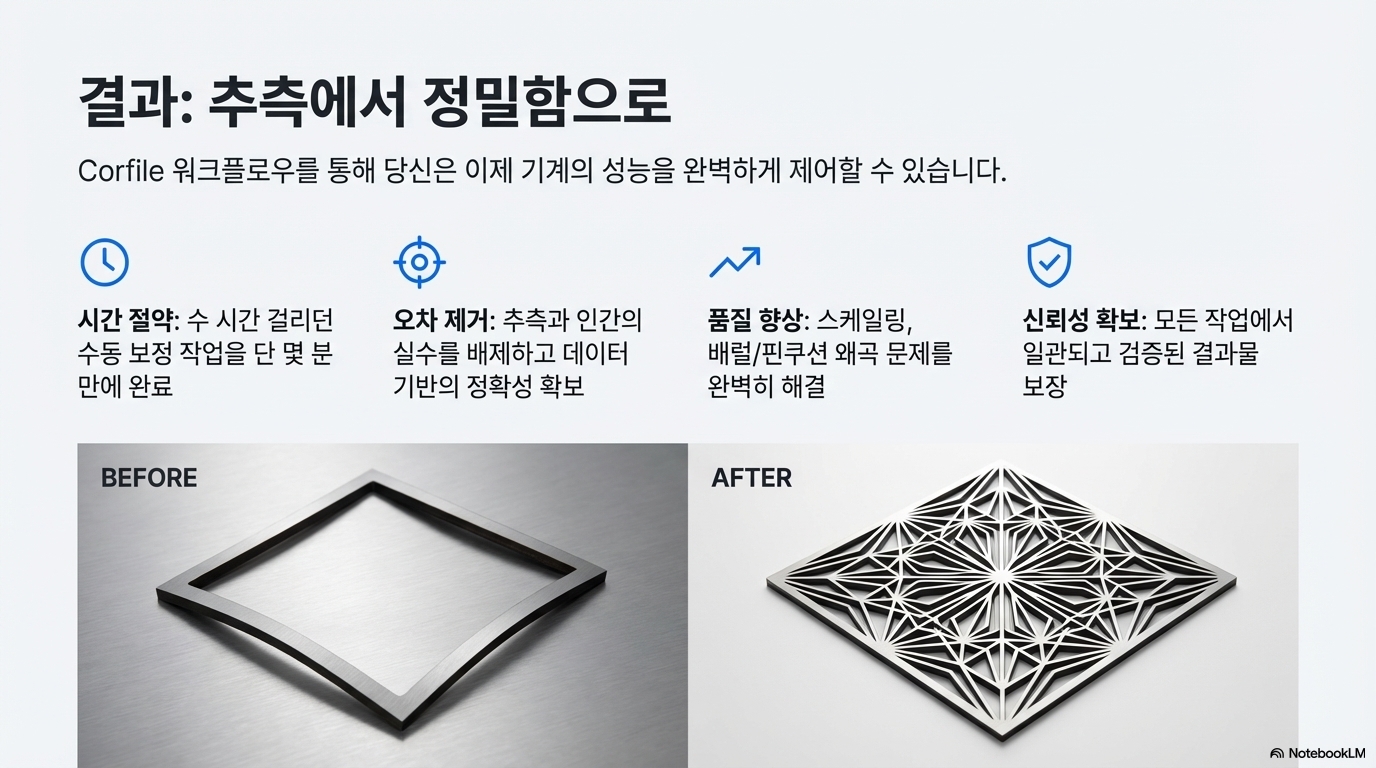 이것이 중요한 이유: 이 자동화된 프로세스는 사용자의 추측에 의존하던 작업을 없애고, 그 과정에서 발생할 수 있는 사람의 실수(human error)를 원천적으로 차단합니다. 결과적으로, 비교할 수 없을 만큼 정확하고 극적으로 빠른 보정이 가능해집니다.
