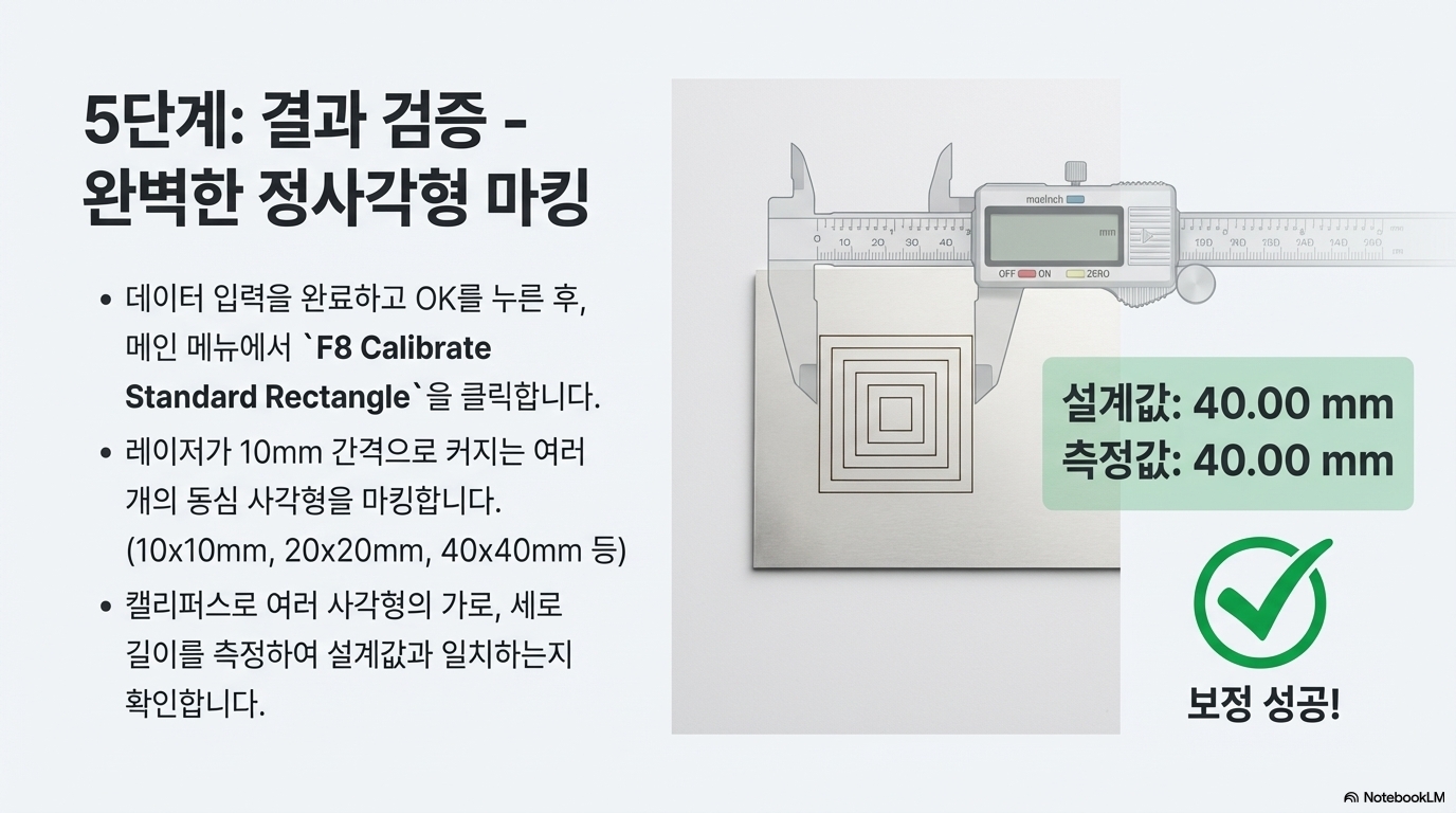 Corfile 2 창에서 "f8 calibrate standard rectangle" 버튼을 클릭하십시오. 이 기능은 여러분의 테스트 재료 위에 10mm, 20mm, 30mm 등 정확한 치수의 동심 사각형들을 마킹합니다. 캘리퍼스를 사용하여 이 사각형들의 실제 크기를 측정해 보세요. 100mm로 마킹된 사각형이 실제로 100mm에 가깝게 측정된다면, 여러분의 보정 파일이 정확하다는 것을 의미합니다. 이 검증을 통해 확신을 갖고 다음 단계로 넘어갈 수 있습니다.