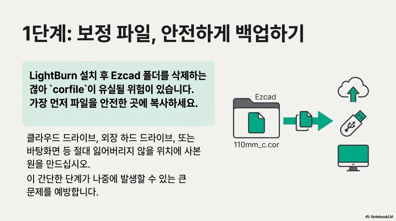 따라서 Ezcad 폴더에 저장된 .corfile을 복사하여 바탕화면, 클라우드 드라이브(구글 드라이브, 드롭박스 등), 또는 별도의 USB나 외장 하드 드라이브에 반드시 사본을 만들어 두세요. 이 사소하지만 결정적인 단계 하나가 미래의 골칫거리를 막아주는 가장 확실한 방법입니다.