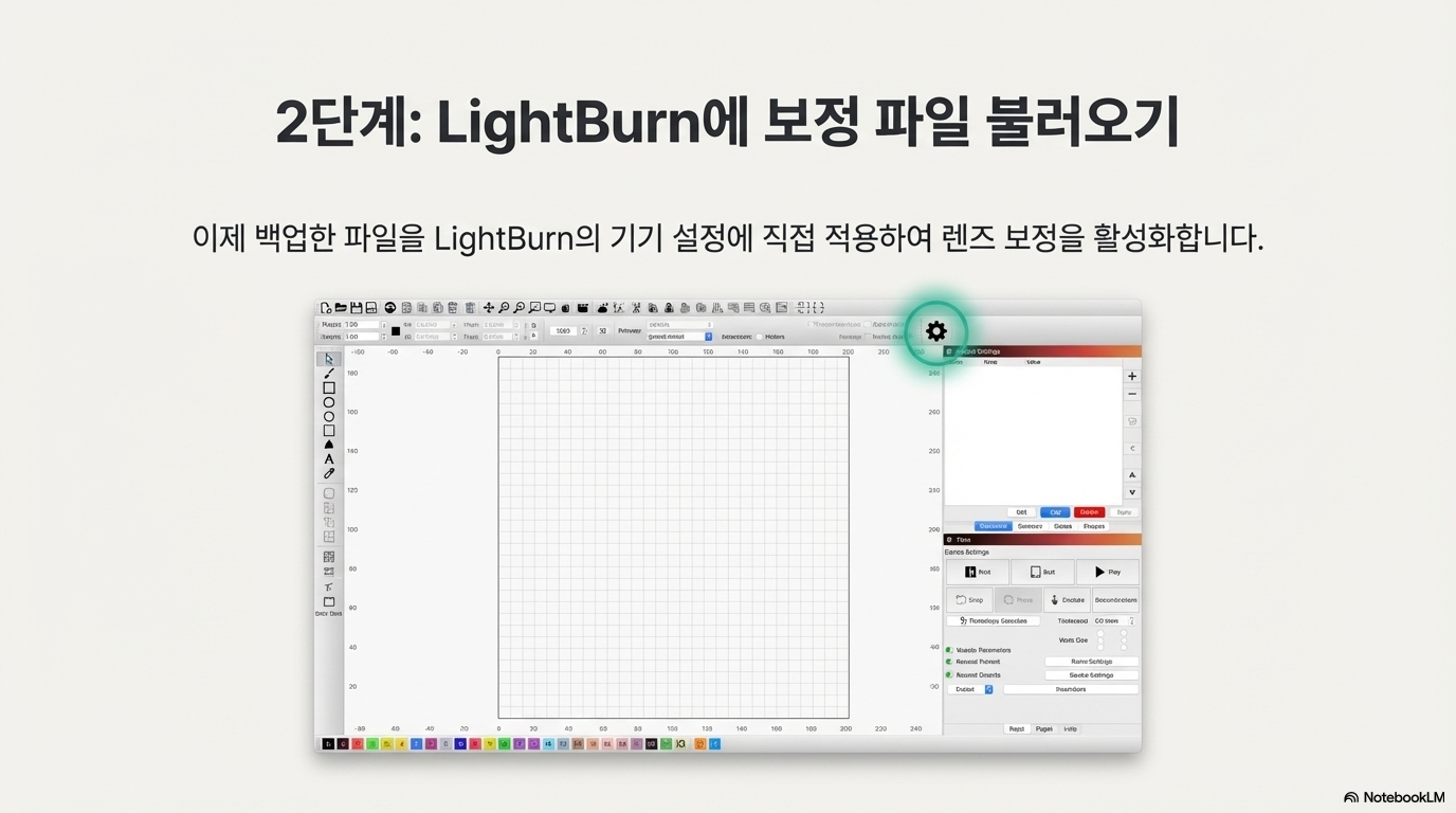 백업을 마쳤다면 이제 LightBurn에 보정 파일을 적용할 차례입니다. 과정은 놀랍도록 간단합니다.
