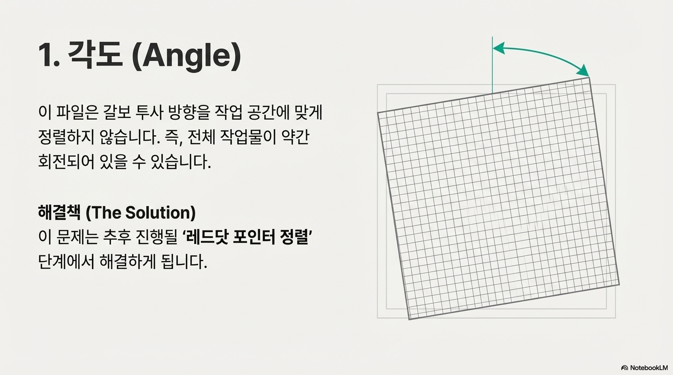 보정 파일은 렌즈의 왜곡을 바로잡는 역할만 할 뿐, 레이저가 투사되는 전체 작업 공간의 회전 각도를 정렬하지는 않습니다. 즉, 작업 공간과 레이저의 투사 방향이 약간 틀어져 있을 수 있으며, 이것은 보정 파일로 해결되지 않습니다. 이 '각도' 문제는 추후 '레드닷(red dot)' 정렬 설정 과정에서 다루어집니다.