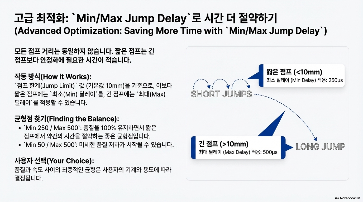 진짜 해결책은 점프 속도를 낮추는 것이 아닙니다. 점프 속도는 빠르게 유지하되, '점프 딜레이(Jump Delay)' 값을 적절히 설정하는 것이 핵심입니다. 점프 딜레이란, 갈보 미러가 다음 작업 위치로 빠르게 이동한 후, 이동으로 인해 발생한 미세한 진동이 완전히 멈출 때까지 잠시 기다려주는 시간입니다.