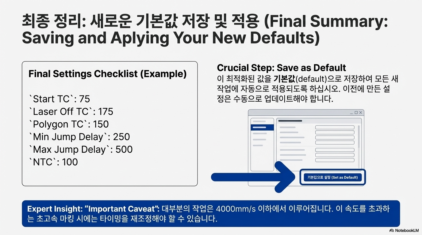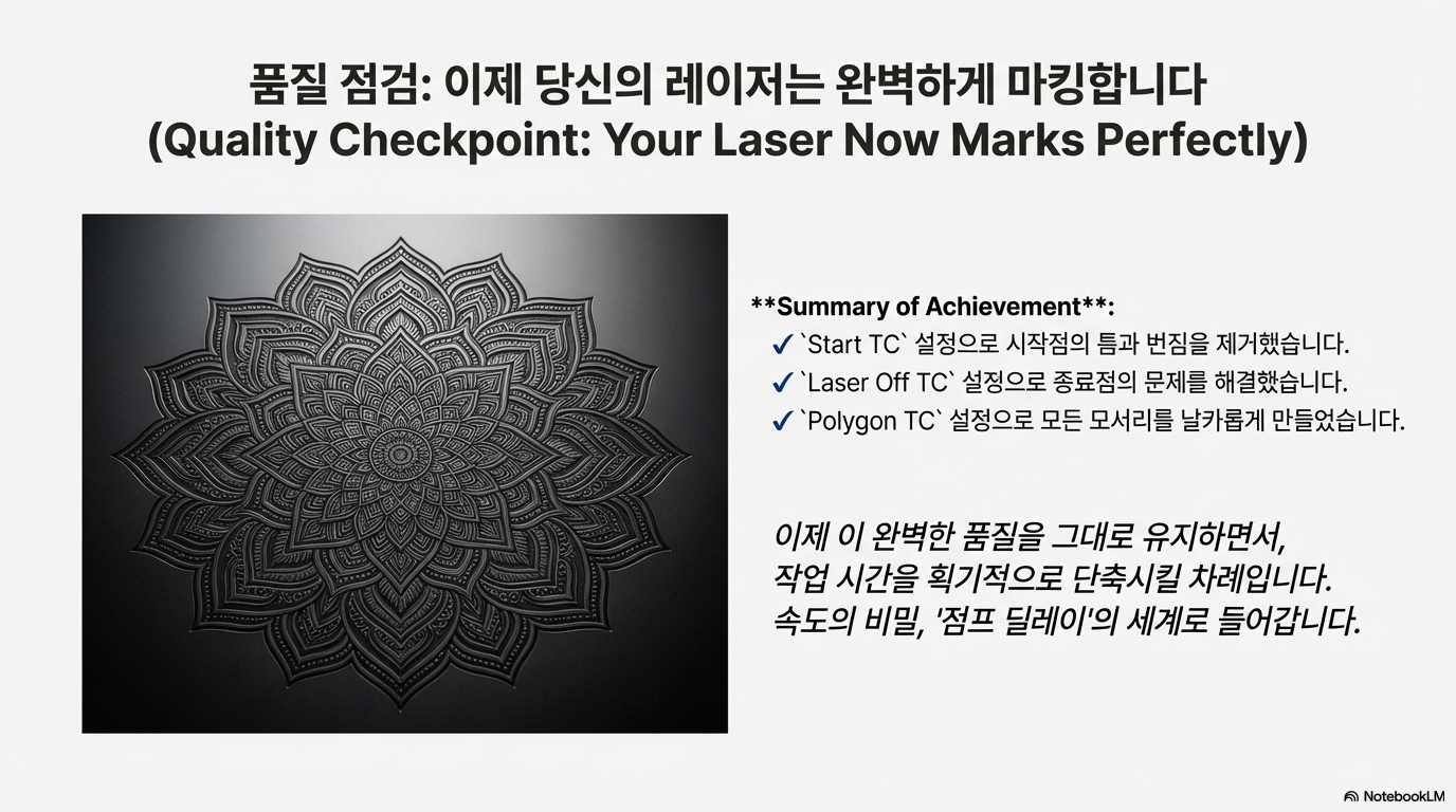 우리는 오늘 Start TC와 코너 제어의 비밀을 통해 보이지 않던 원인을 파악하는 법을 배웠고, '점프 딜레이'를 활용해 속도와 품질이라는 거짓된 타협을 끝내는 방법을 확인했습니다. 또한, 타이밍 값은 한번 제대로 설정하면 대부분의 작업에서 유효하며, NTC 같은 불필요한 설정은 과감히 무시해도 된다는 효율성의 원칙도 깨우쳤습니다. 레이저 타이밍 설정에 대한 깊은 이해는 당신을 단순한 사용자에서 전문가로 이끌어주는 열쇠입니다.
