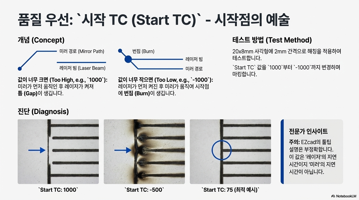 이 설정의 원리는 간단합니다. 레이저의 '발사 타이밍'을 조절하는 것입니다. 값이 너무 크면 레이저가 너무 늦게 켜져 미러가 먼저 출발해버리니 라인 시작점에 공백이 생기고, 값이 너무 작으면 미러가 움직이기도 전에 레이저가 발사되어 시작점을 태워버리는 '번인(burn-in)'이 발생합니다.