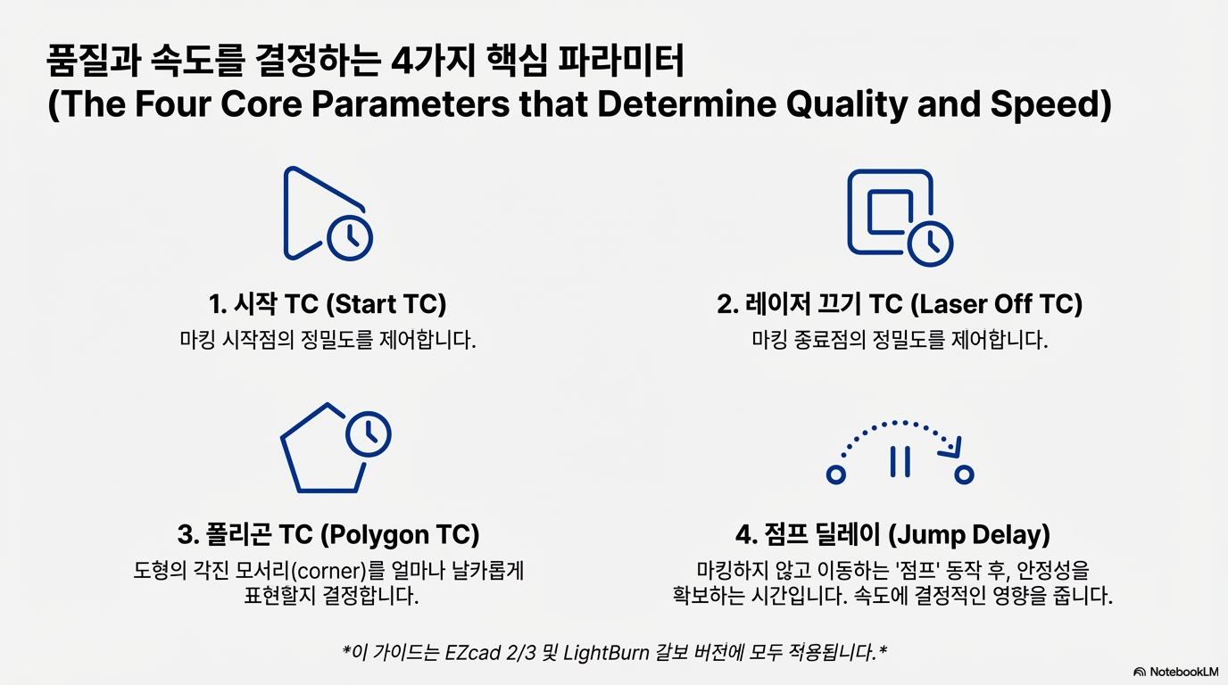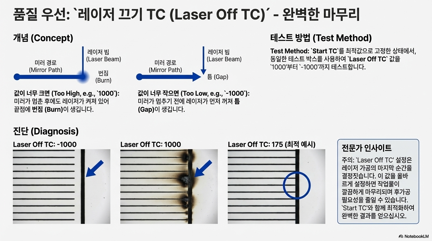 이 지식은 문제 해결의 지름길을 알려줍니다. 만약 사각형의 오른쪽 위 코너가 둥글게 깎인다면, Start TC나 Laser Off TC를 아무리 만져봐야 소용없습니다. 원인은 바로 Polygon TC 값이 너무 짧기 때문입니다. 이렇게 정확한 원인을 알면 엉뚱한 설정을 붙잡고 시간을 낭비하는 일을 막을 수 있습니다.