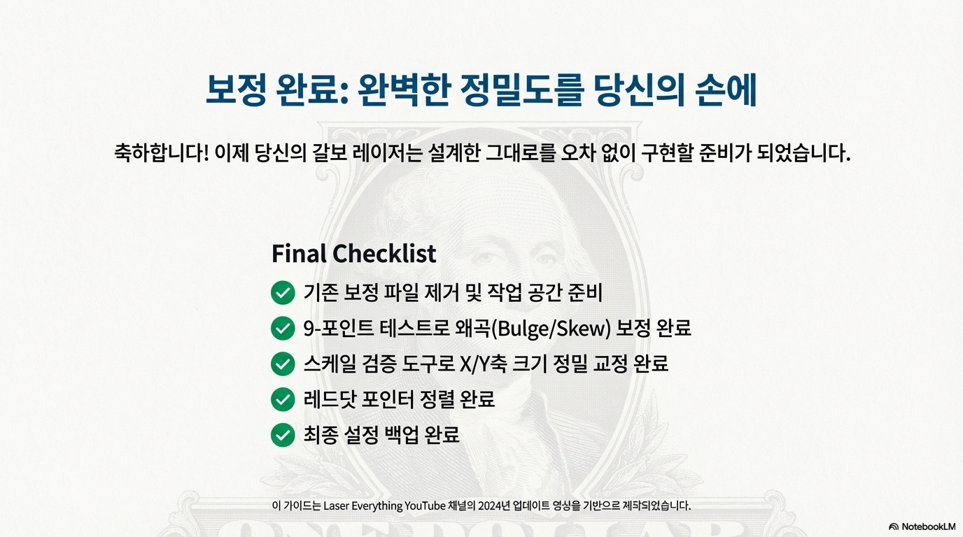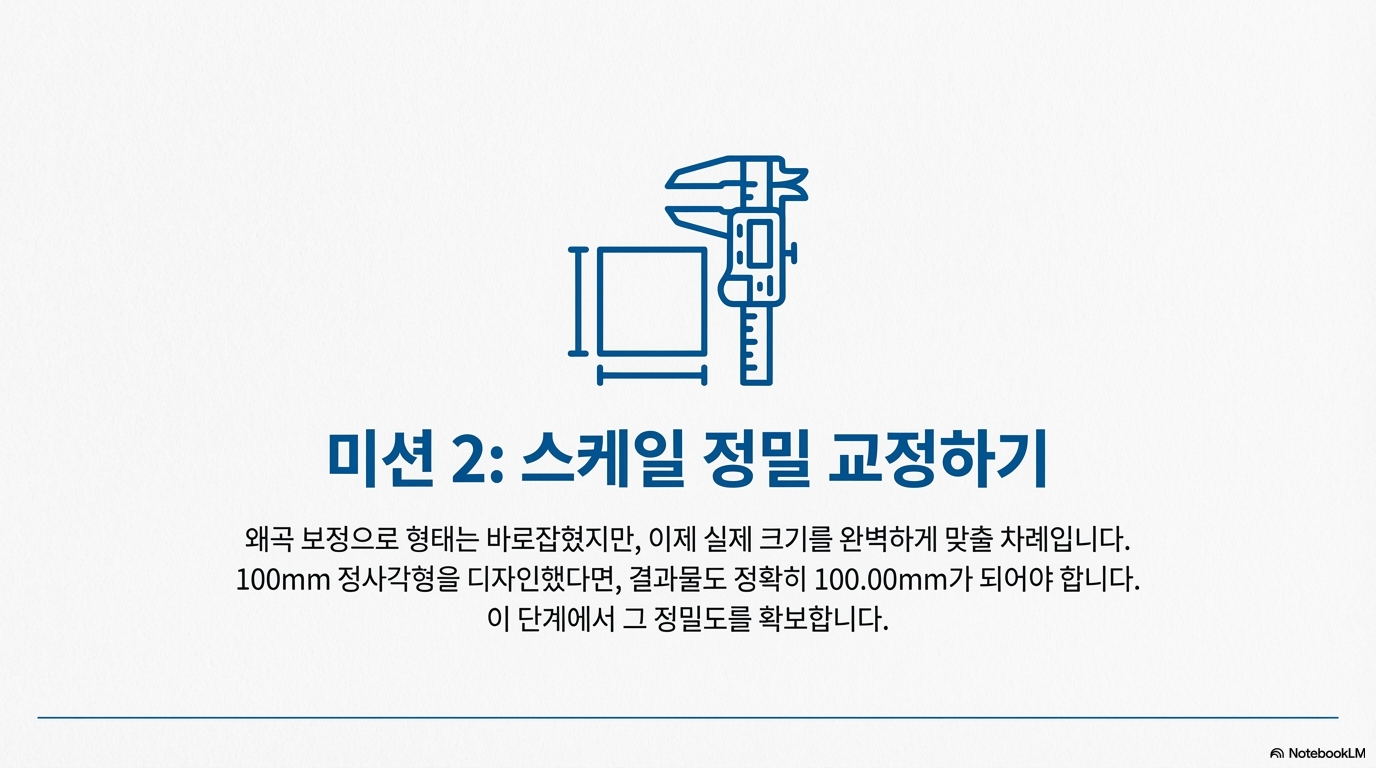 하지만 전문가들은 여기서 멈추지 않습니다. 마지막으로 한 번 더 검증하여 오차 없는 완벽함을 보장합니다. 보정이 적용된 후, 100mm x 100mm와 같이 다른 일반적인 크기의 정사각형을 다시 한번 마킹하고 측정해보세요. 소스 영상의 전문가는 이 과정을 거쳐 "이 경우, Y축과 X축 모두 정확히 100mm로 완벽하게 맞았습니다"라고 확인했습니다. 이 최종 검증이야말로 진정한 치수 정확도를 보장하는 프로의 방식입니다.