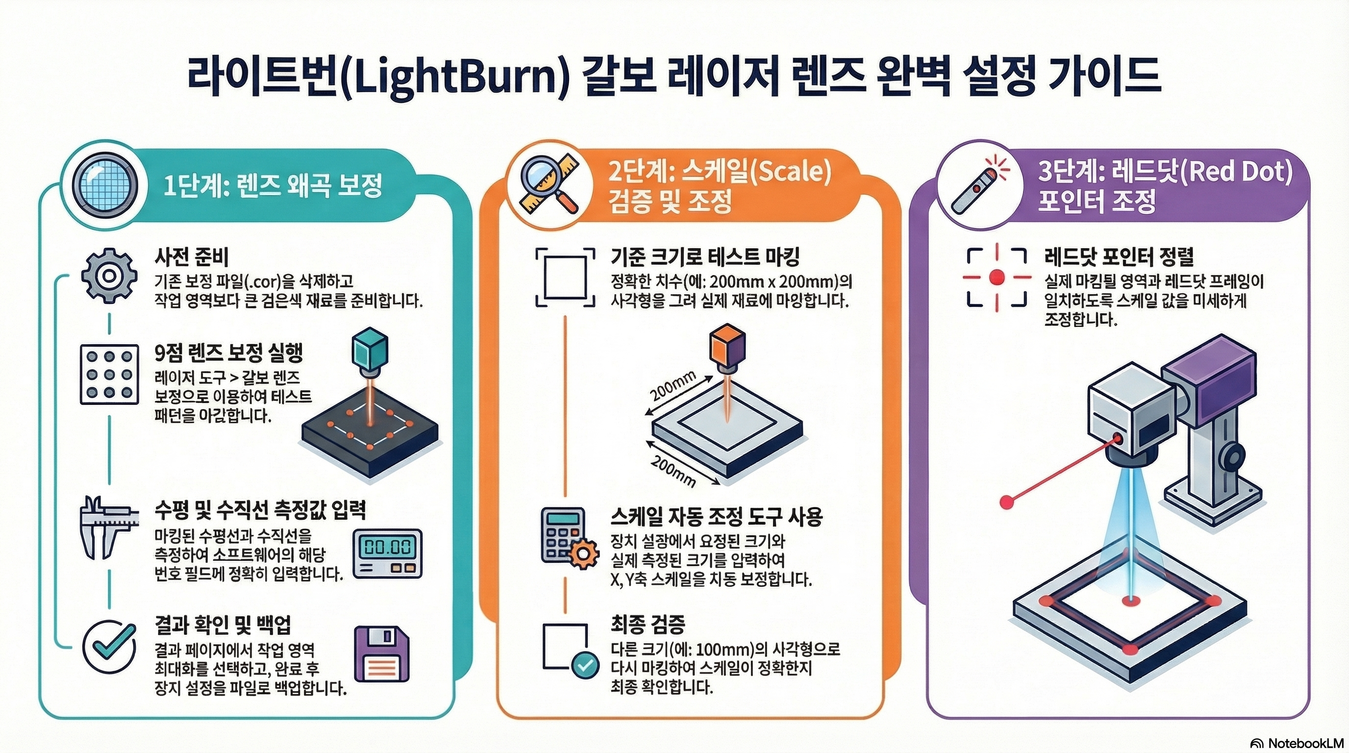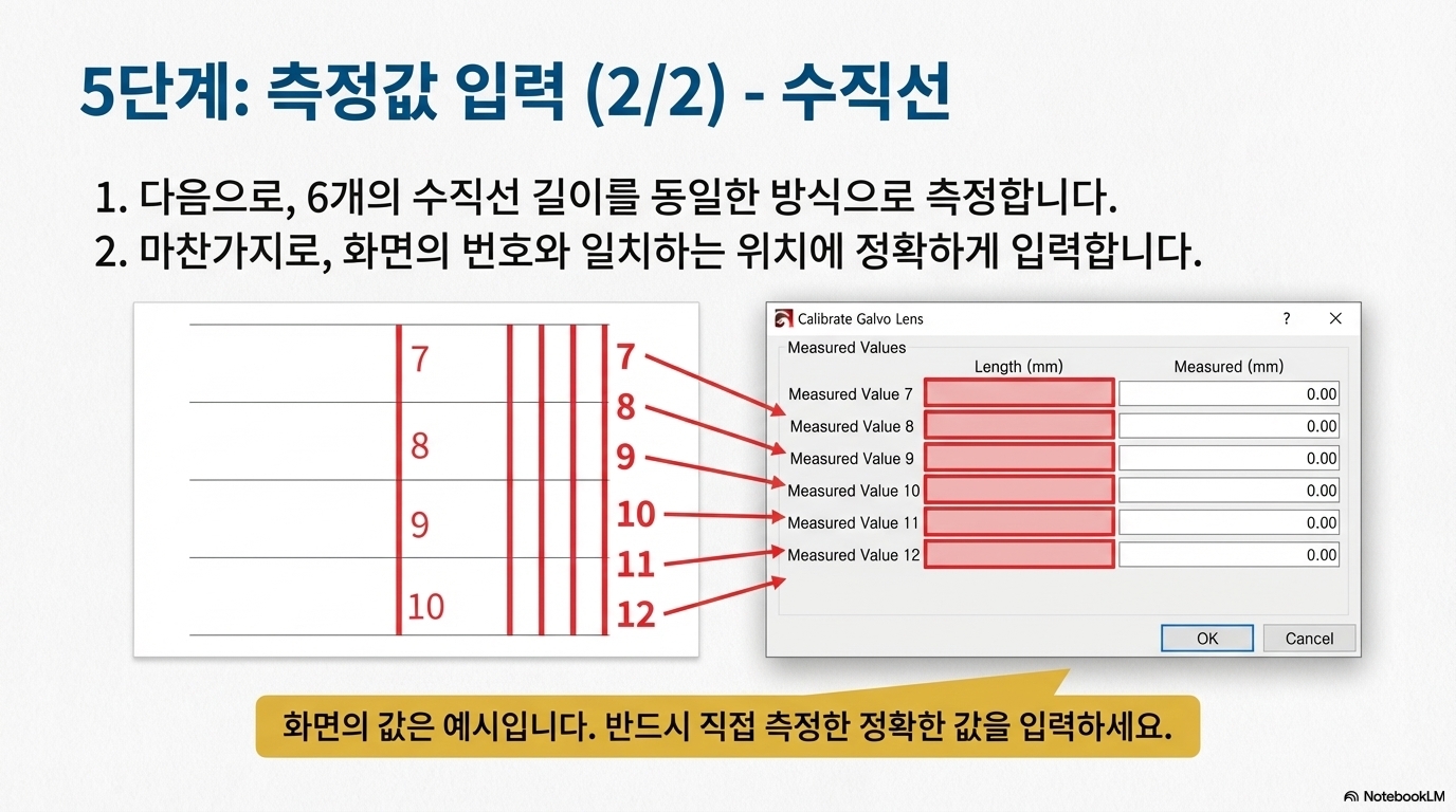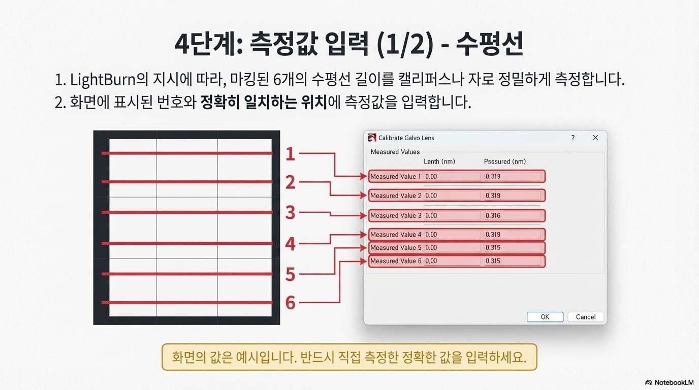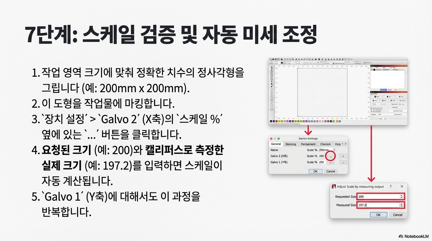 진정한 정밀도를 위해서는 반드시 수동 검증 단계를 거쳐야 합니다. 방법은 간단합니다. 작업 영역에 200mm x 200mm와 같이 크기를 정확히 아는 큰 정사각형을 그린 후, 레이저로 마킹하고, 실제 출력물의 가로세로 길이를 자로 직접 측정하는 것입니다.