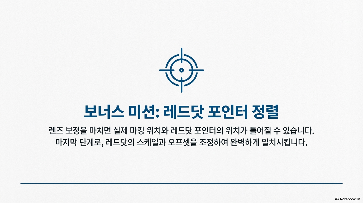 9포인트 렌즈 보정 마법사를 완료했다고 해서 모든 설정이 끝난 것은 아닙니다. 이 마법사는 렌즈의 '팽창(bulge)'과 '비틀림(skew)' 같은 왜곡은 훌륭하게 보정하지만, 전체적인 '스케일(scale)'의 정확도는 아직 검증되지 않았습니다.