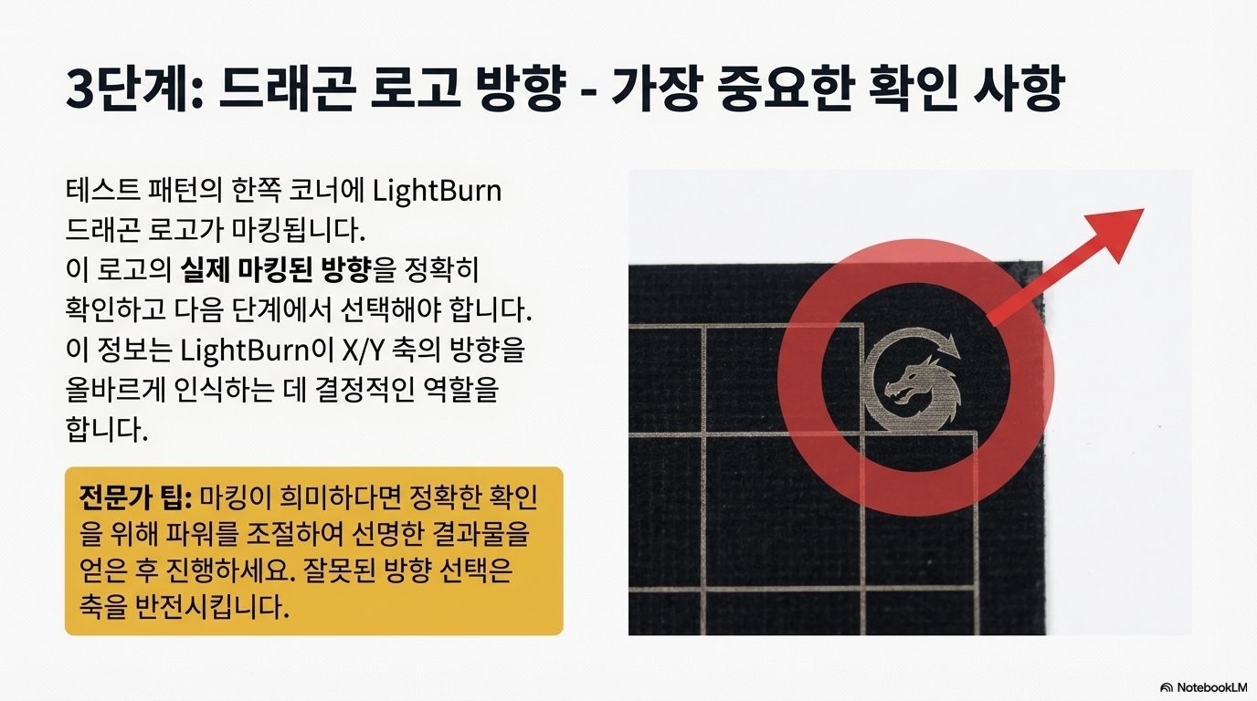 이 드래곤 로고의 방향은 단순한 테스트 마크가 아닙니다. 이것은 LightBurn이 X축과 Y축, 그리고 각 축의 방향(왼쪽/오른쪽, 위/아래)을 결정하는 핵심적인 기준이 됩니다. 실제 재료에 새겨진 드래곤의 방향을 소프트웨어에서 정확하게 선택해야 합니다.