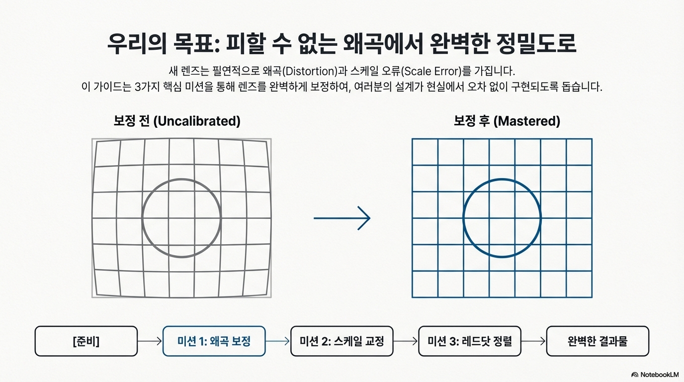 9포인트 렌즈 보정 마법사를 완료했다고 해서 모든 설정이 끝난 것은 아닙니다. 이 마법사는 렌즈의 '팽창(bulge)'과 '비틀림(skew)' 같은 왜곡은 훌륭하게 보정하지만, 전체적인 '스케일(scale)'의 정확도는 아직 검증되지 않았습니다.