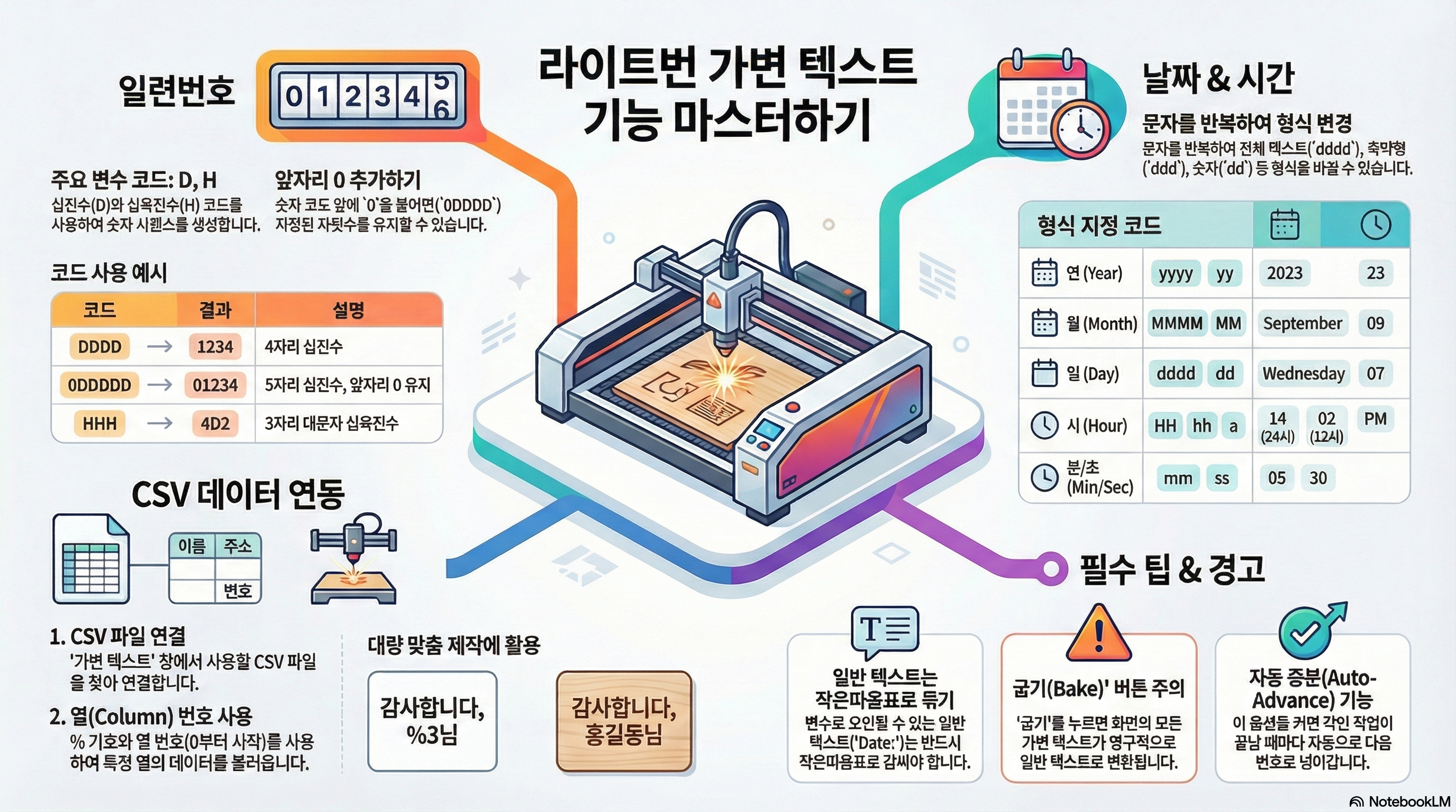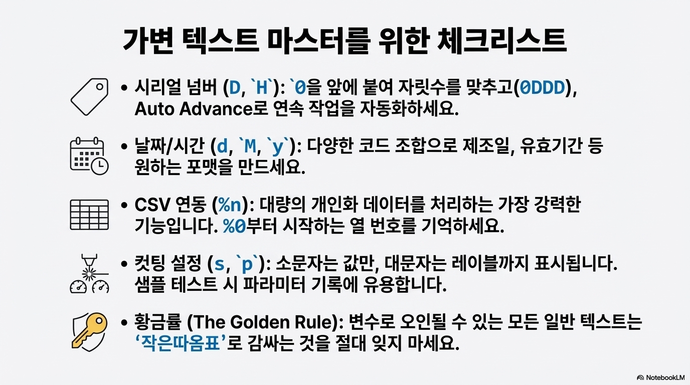 LightBurn의 변수 텍스트는 단순히 일련번호를 자동으로 늘리는 도구가 아닙니다. 이는 CSV 파일 연동, 오류 방지를 위한 구문 규칙, 전문가 수준의 설정값 기록, 그리고 강력하지만 신중하게 사용해야 할 기능까지 포함된 정교한 자동화 스위트입니다. 오늘 소개된 네 가지 기능을 마스터한다면, 반복 작업에 낭비되던 엄청난 시간을 절약하고 실수를 줄여 한 차원 높은 작업 효율을 경험하게 될 것입니다.
