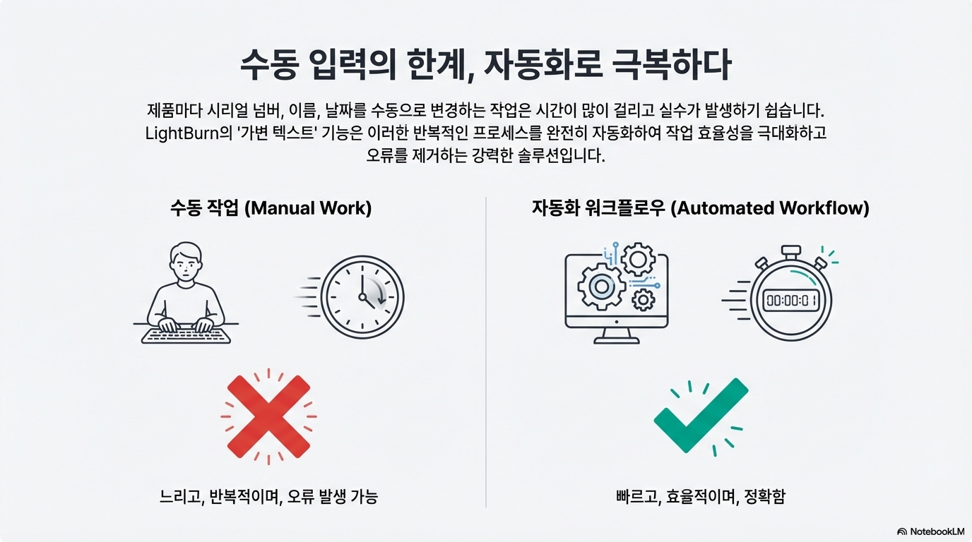 레이저 각인 작업을 하다 보면, 특히 대량 생산 시 반복적인 텍스트 수정 때문에 골머리를 앓는 경우가 많습니다. 수십, 수백 개의 제품에 각기 다른 일련번호, 날짜, 또는 이름을 새겨야 할 때마다 수동으로 텍스트를 바꾸는 것은 지루할 뿐만 아니라 치명적인 실수를 유발할 수 있습니다. 바로 이 문제를 해결하기 위해 LightBurn에는 '변수 텍스트(Variable Text)'라는 강력한 기능이 탑재되어 있습니다.