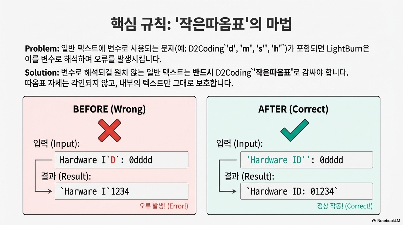 변수 텍스트 코드와 일반 텍스트를 함께 사용할 때, 의도치 않은 문자가 출력되어 당황한 경험이 있으신가요? 이는 LightBurn이 일반 텍스트의 특정 문자를 변수 코드로 오인하기 때문에 발생하며, '작은따옴표'(' ') 하나로 완벽하게 해결할 수 있습니다.
