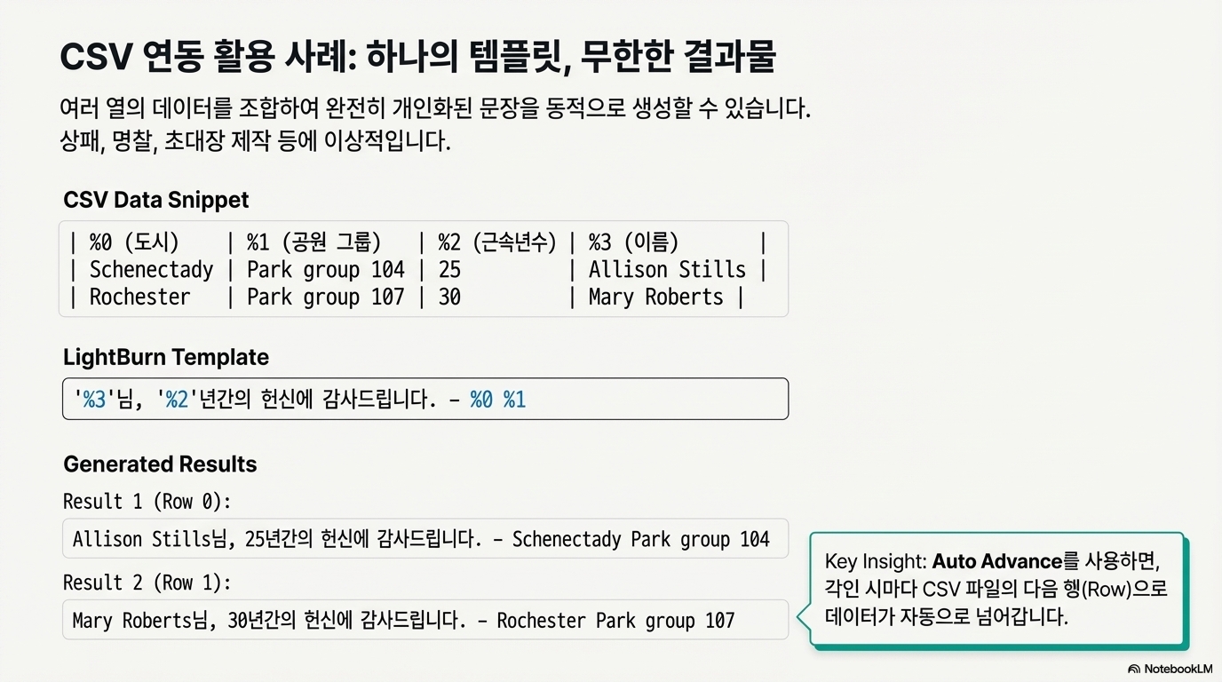 변수 텍스트의 가장 강력한 활용법은 단연 'CSV 병합(Merge CSV)' 기능입니다. 이 기능을 사용하면 이름, 직책, 날짜 등 각기 다른 정보가 담긴 수백 개의 데이터를 단 하나의 템플릿으로 완벽하게 자동화할 수 있습니다.