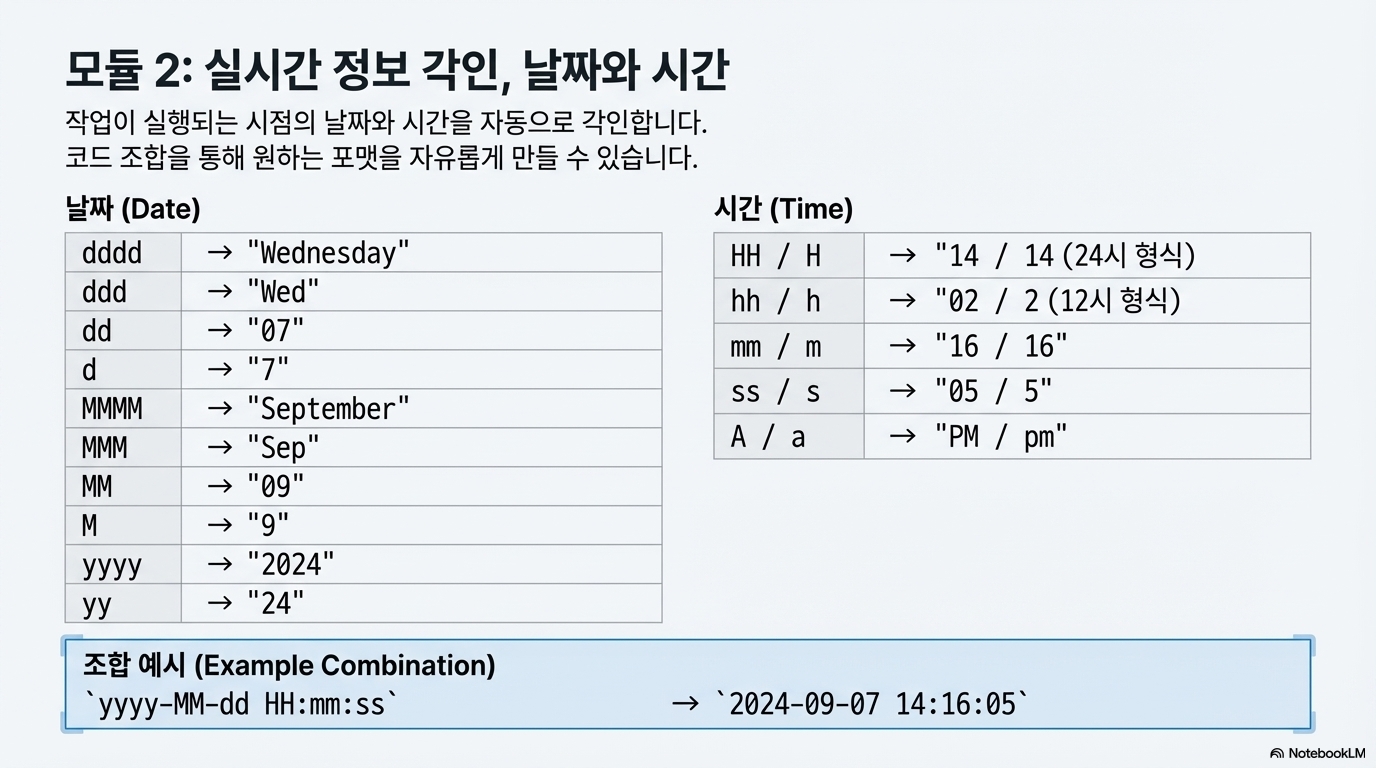 예를 들어 날짜 코드 앞에 'Date at'이라는 문구를 추가하고 싶다고 가정해 봅시다. 만약 Date at [날짜 코드] 라고 입력하면, LightBurn은 a를 오전/오후(AM/PM) 코드로, t를 시간대(Time zone) 코드로 인식하여 "am eastern daylight time"과 같은 엉뚱한 결과를 날짜 중간에 삽입해 버립니다.
