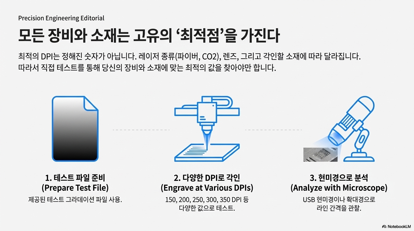 레이저 빔이 '마카펜'처럼 두꺼울수록, 사용해야 하는 해상도(DPI)는 '낮아져야' 합니다. 이것이 첫 번째 핵심 원칙입니다.