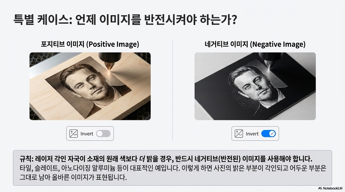 이러한 재료들은 레이저가 닿으면 어둡게 타는 것이 아니라, 표면을 벗겨내거나 화학적 변화를 일으켜 하얀 자국을 남깁니다. 즉, 레이저가 '어두움'이 아닌 '밝음'을 더하는 역할을 하는 것입니다. 따라서 이미지 데이터를 뒤집어주어야 최종 결과물이 올바르게 보입니다.