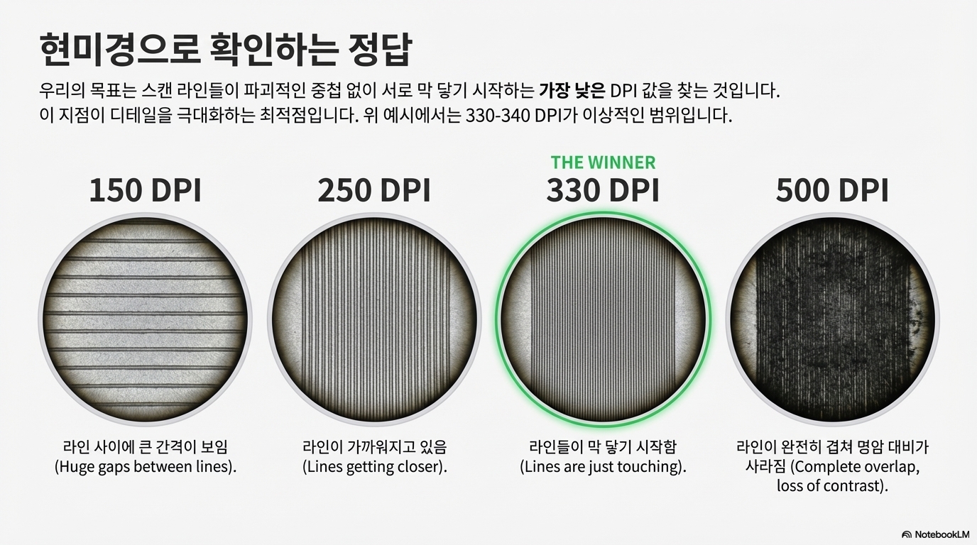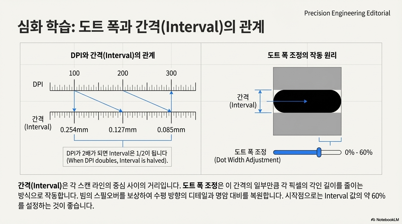 해상도(DPI) 설정을 너무 높이면, 소프트웨어는 좁은 공간에 더 많은 픽셀 라인을 억지로 집어넣으려고 합니다. 각 라인은 물리적인 폭을 가지고 있기 때문에, 결국 이 라인들은 서로 겹치게 됩니다.