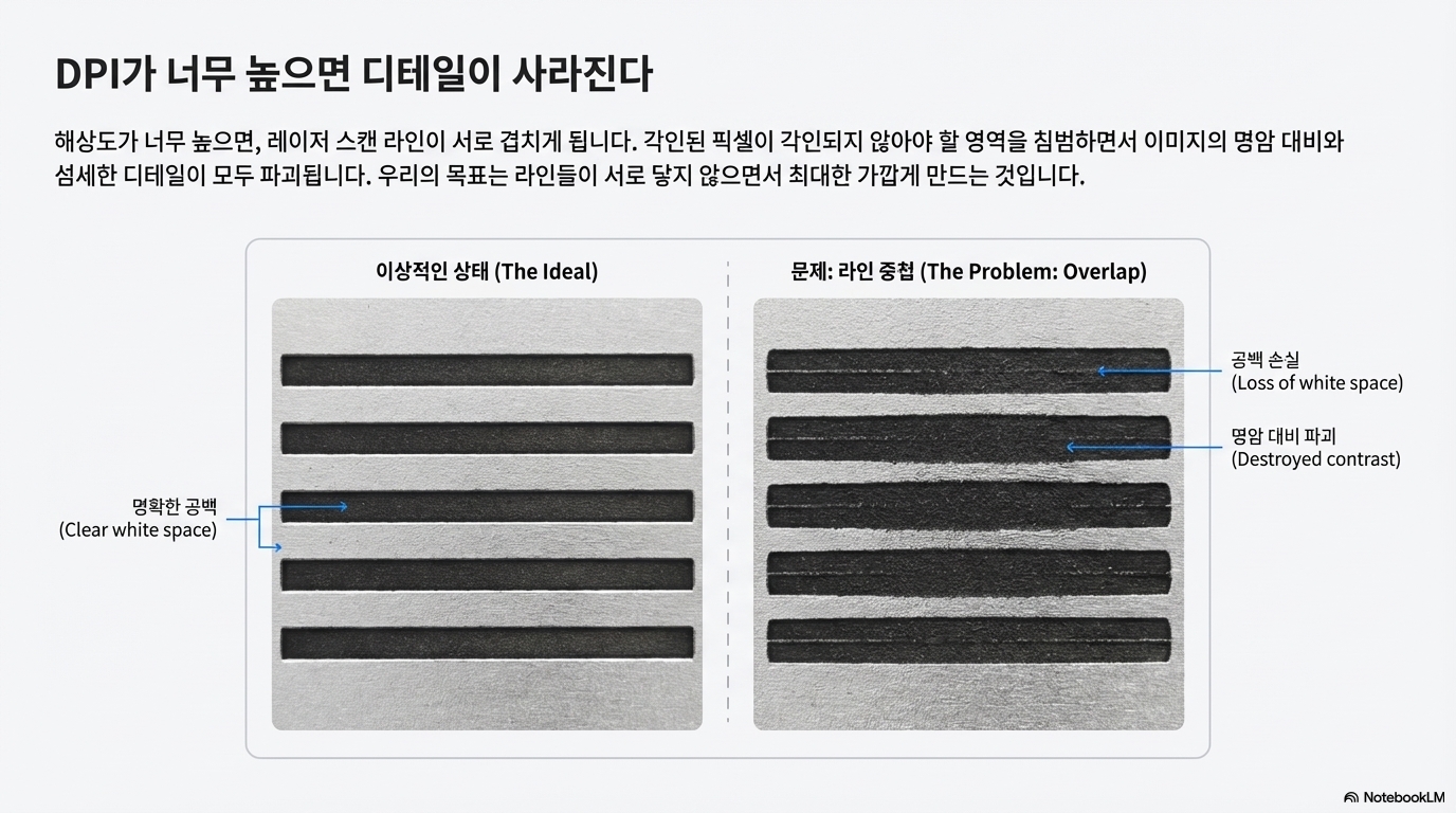 이 비유처럼, 레이저 빔의 '두께'가 있는데 너무 촘촘하게 선을 그으려고 하면 겹쳐질 수밖에 없습니다. 이 겹침 현상은 각인되지 않아야 할 영역까지 태워버려 이미지의 밝은 부분과 어두운 부분의 대비(contrast)를 완전히 망가뜨립니다. 결과적으로 디테일은 사라지고 이미지는 뿌옇게 "날아가 버린" 것처럼 보이게 됩니다.