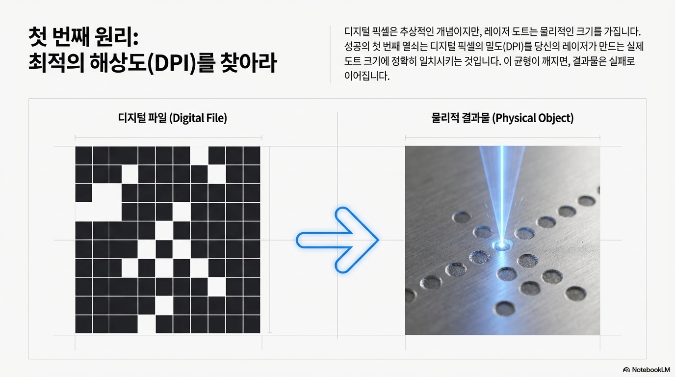 레이저 빔이 '마카펜'처럼 두꺼울수록, 사용해야 하는 해상도(DPI)는 '낮아져야' 합니다. 이것이 첫 번째 핵심 원칙입니다.