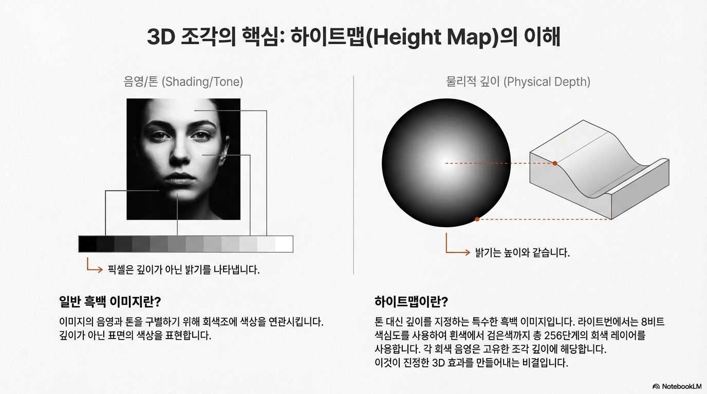 일반 사진은 음영 구분을 위해 회색조에 톤(tone)을 부여하지만, 3D 각인 시스템은 그 톤을 색이 아닌 '깊이' 정보로 해석하기 때문입니다. 즉, 톤의 차이가 곧 물리적인 깊이의 차이가 되는 것입니다.