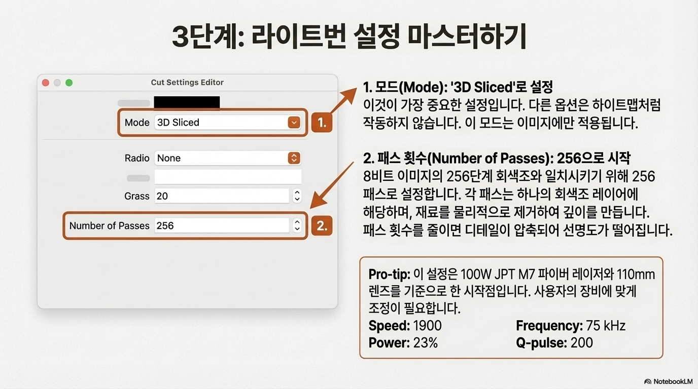 Lightburn 소프트웨어의 '3D 슬라이스(3D Sliced)' 모드에서 작업할 때, '256'이라는 숫자는 마법과도 같은 힘을 발휘합니다. 바로 패스(Passes) 횟수를 설정하는 값입니다.