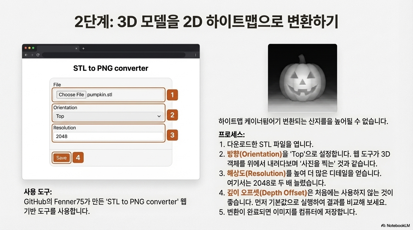 따라서 성공적인 3D 각인을 위해서는 3D 모델 파일(STL 등)을 적절한 높이 지도로 변환하는 과정이 반드시 필요합니다.