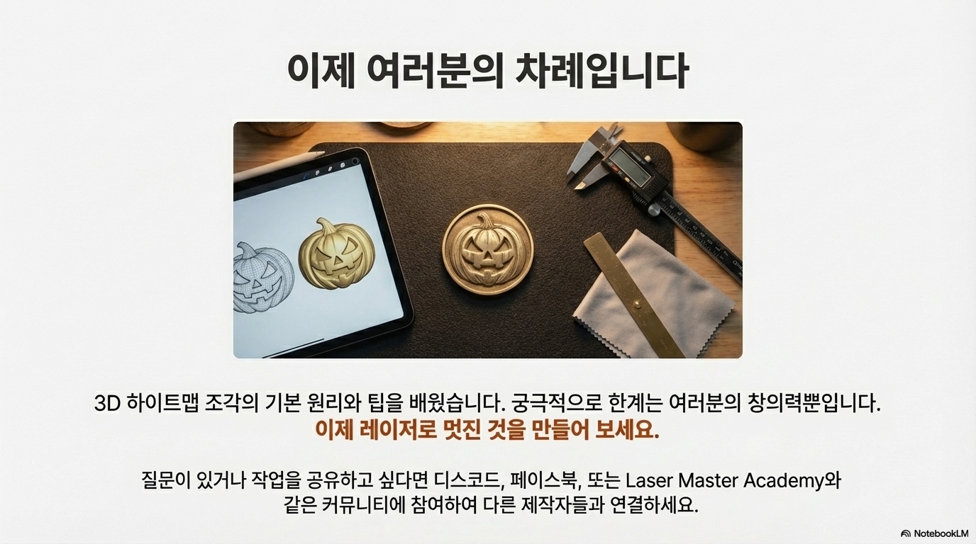 3D 레이저 각인은 단순히 버튼을 누르는 것 이상의 섬세한 과정입니다. 설정값 뒤에 숨겨진 '이유'를 이해하는 것이야말로 평범한 결과물과 놀라운 작품을 가르는 결정적인 차이를 만듭니다. 오늘 소개한 5가지 비법은 여러분의 시행착오를 줄이고, 창의적인 아이디어를 현실로 만드는 든든한 발판이 되어줄 것입니다.
