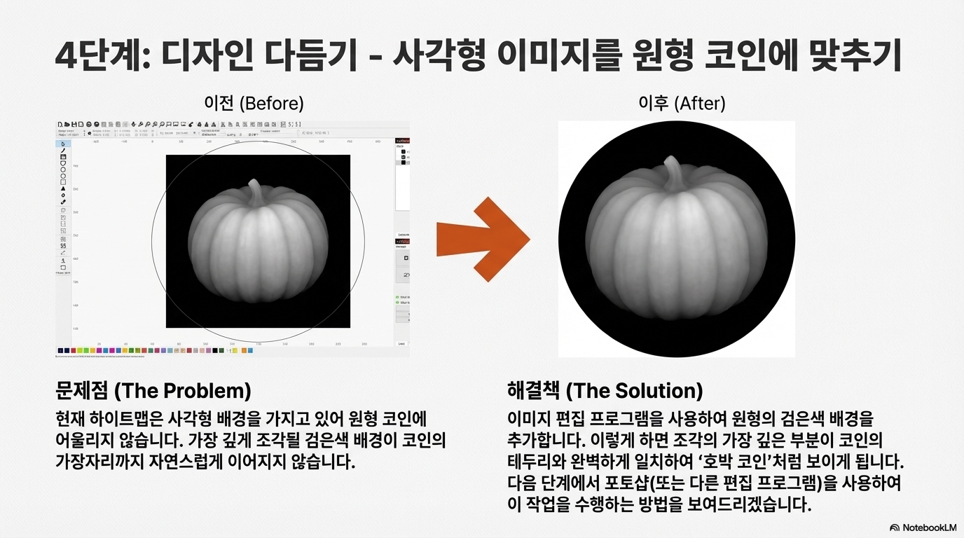 정사각형의 높이 지도 이미지를 원형 동전과 같은 다른 모양의 재료에 딱 맞게 각인하고 싶을 때가 많습니다. 이때 '이미지 마스킹' 기능은 마치 쿠키 커터처럼 디자인을 깔끔하게 잘라내는 강력한 해결책이 됩니다.
