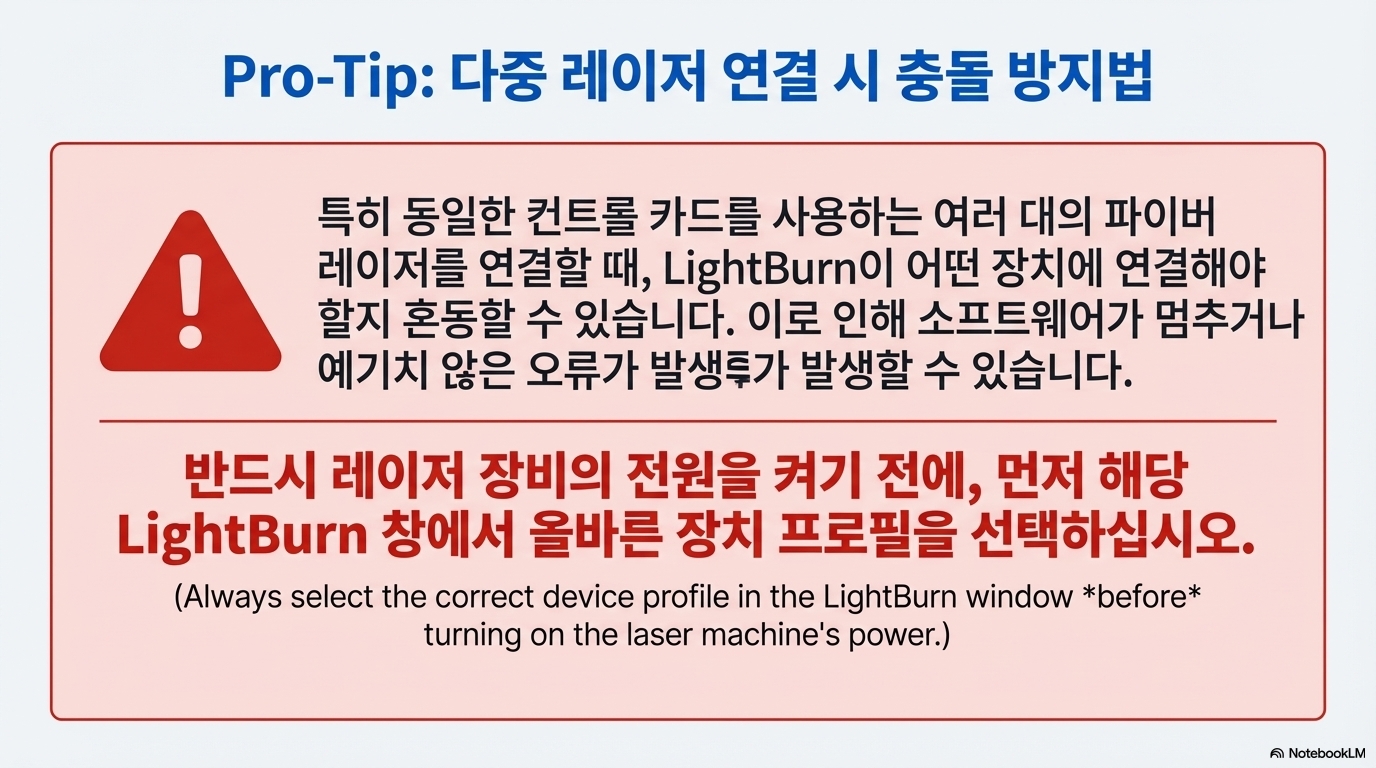 여러 대의 레이저를 한 PC에 연결하여 사용할 때, 간혹 소프트웨어가 멈추거나 연결 오류가 발생하는 경우가 있습니다. 특히 동일한 컨트롤러 카드를 사용하는 장비가 여러 대 있을 때 이런 문제가 발생하기 쉽습니다. 하지만 아주 간단한 규칙 하나만 지키면 이 문제를 완벽하게 예방할 수 있습니다.