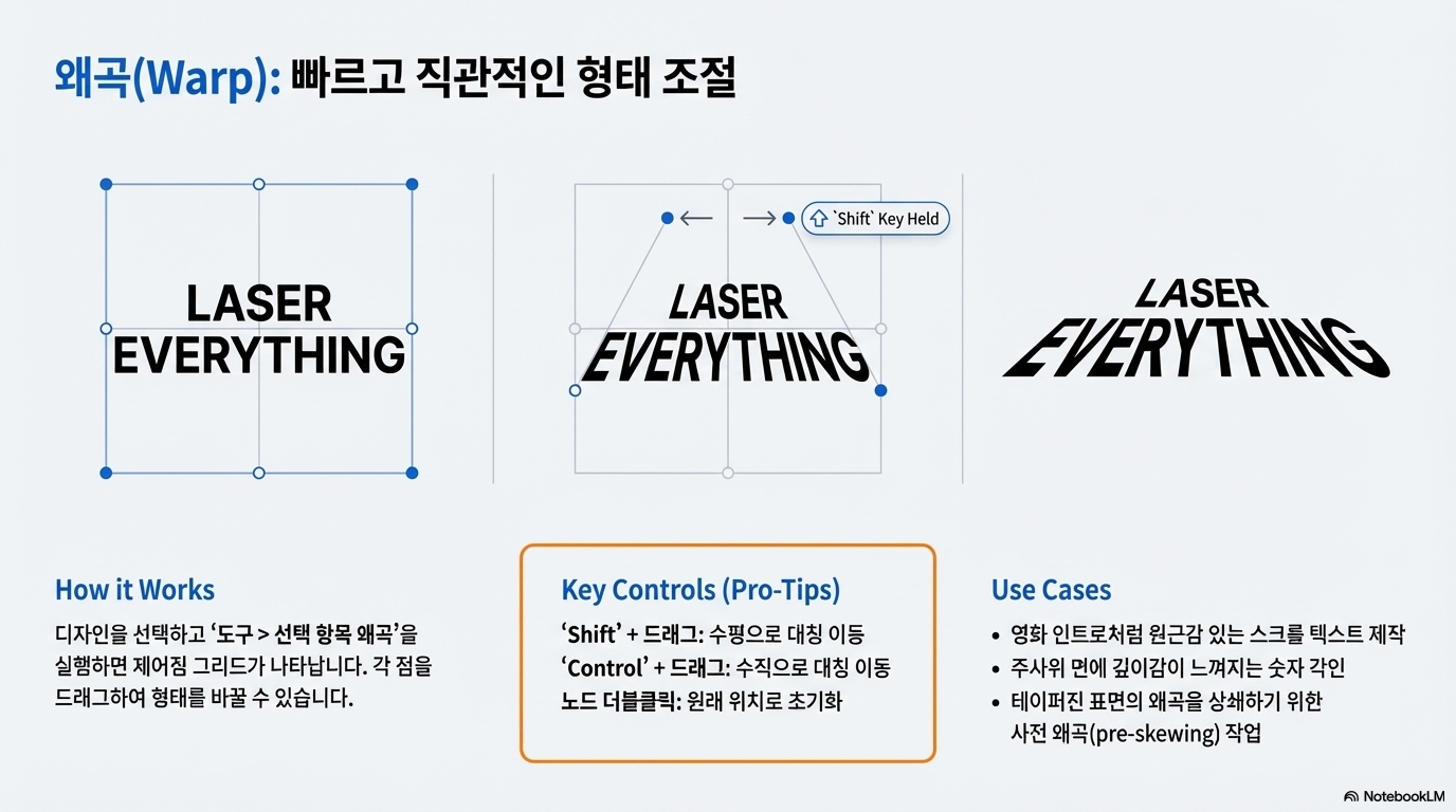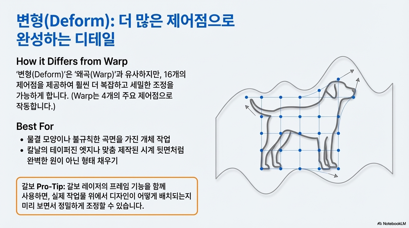 두 도구는 비슷해 보이지만 결정적인 차이가 있습니다. '왜곡'은 4개의 제어점을, '변형'은 16개의 제어점을 제공합니다. 따라서 간단한 조정은 '왜곡'으로, 복잡하고 세밀한 곡선 작업은 '변형'으로 하는 것이 효율적입니다.