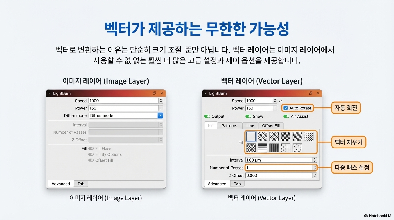 이미지를 벡터로 변환하는 것은 단순히 크기 조절을 자유롭게 하는 것 이상의 의미가 있습니다. 벡터 데이터는 라이트번의 '컷/레이어' 설정에서 훨씬 더 다양한 옵션을 제공하여, 이미지 파일로는 불가능했던 정교하고 복잡한 레이저 작업이 가능해집니다.