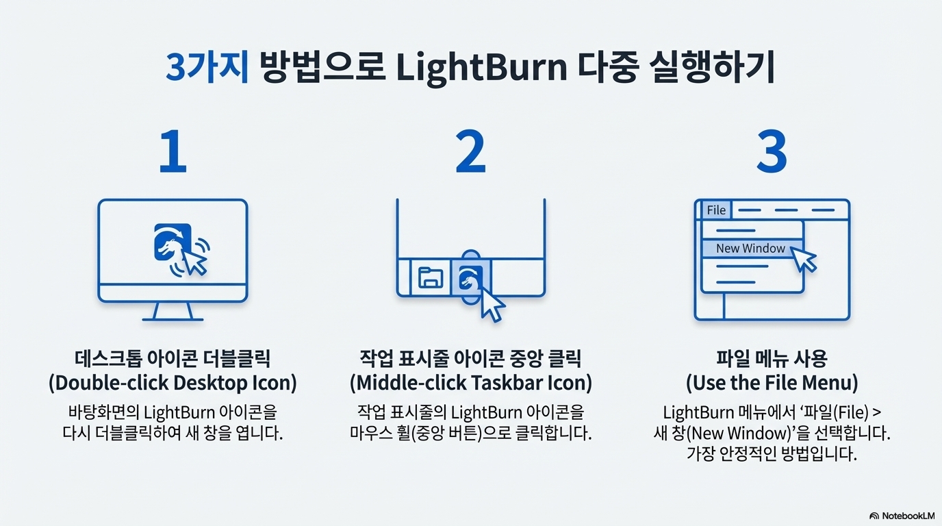 많은 사용자들이 PC 한 대에 라이트번 프로그램 하나, 그리고 레이저 장비 한 대만 연결할 수 있다고 생각합니다. 하지만 이는 고정관념입니다. 실제로는 PC 한 대로 여러 개의 라이트번 창을 동시에 실행하여, 여러 대의 레이저 장비를 각각 독립적으로 제어할 수 있습니다.