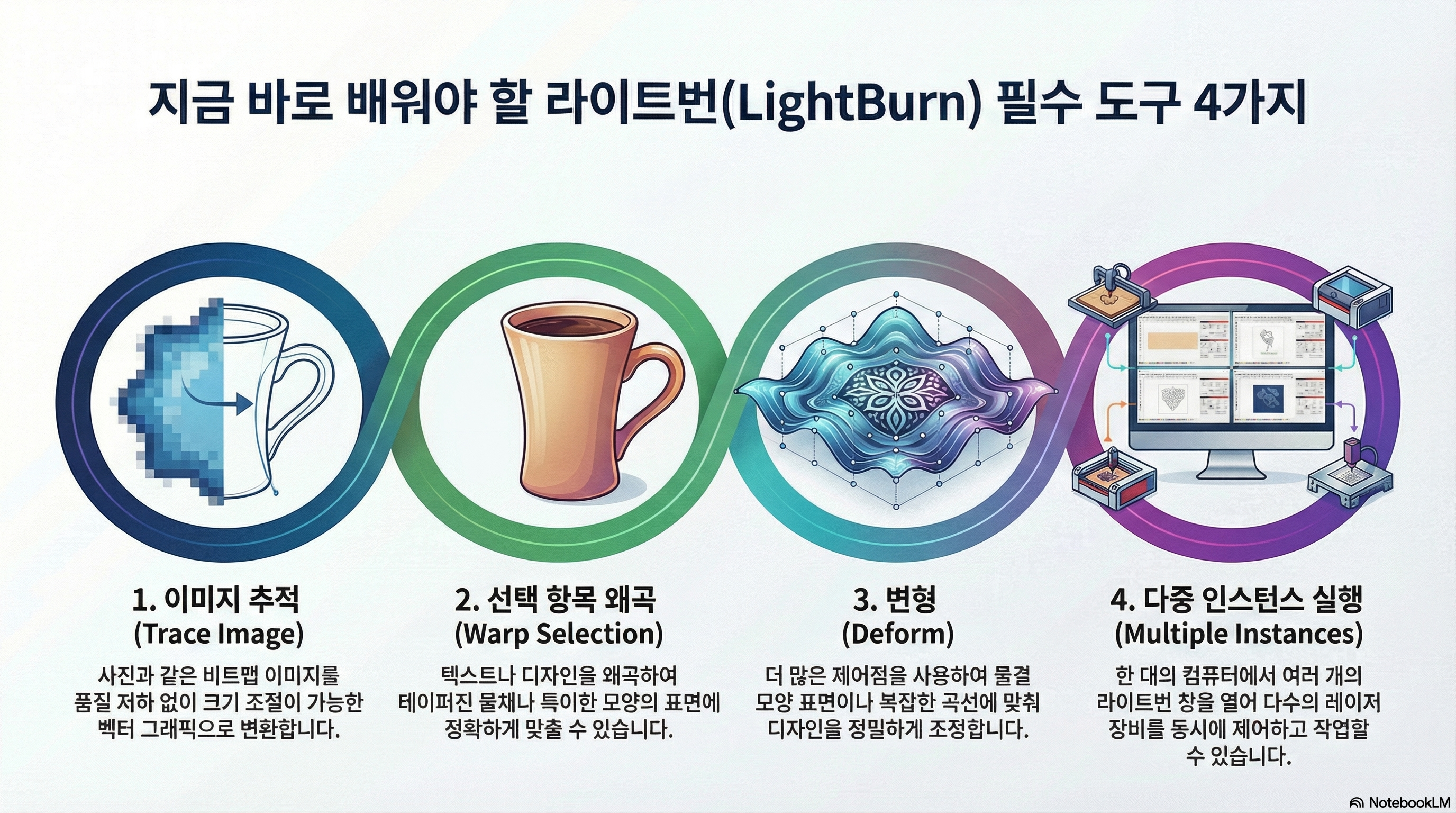 라이트번(LightBurn)을 열고 익숙하게 도형을 그리거나, 텍스트를 입력하고, 파일을 가져와 작업을 시작하시나요? 많은 사용자들이 이 강력한 소프트웨어의 기본적인 기능에만 머물러 있습니다. 하지만 라이트번에는 잘 알려지지 않았지만, 작업 효율과 결과물의 수준을 극적으로 향상시킬 수 있는 강력한 도구들이 숨겨져 있습니다. 이 글에서 소개할 4가지 기능만 제대로 활용해도 당신의 레이저 각인 작업은 완전히 새로운 차원으로 도약할 것입니다.