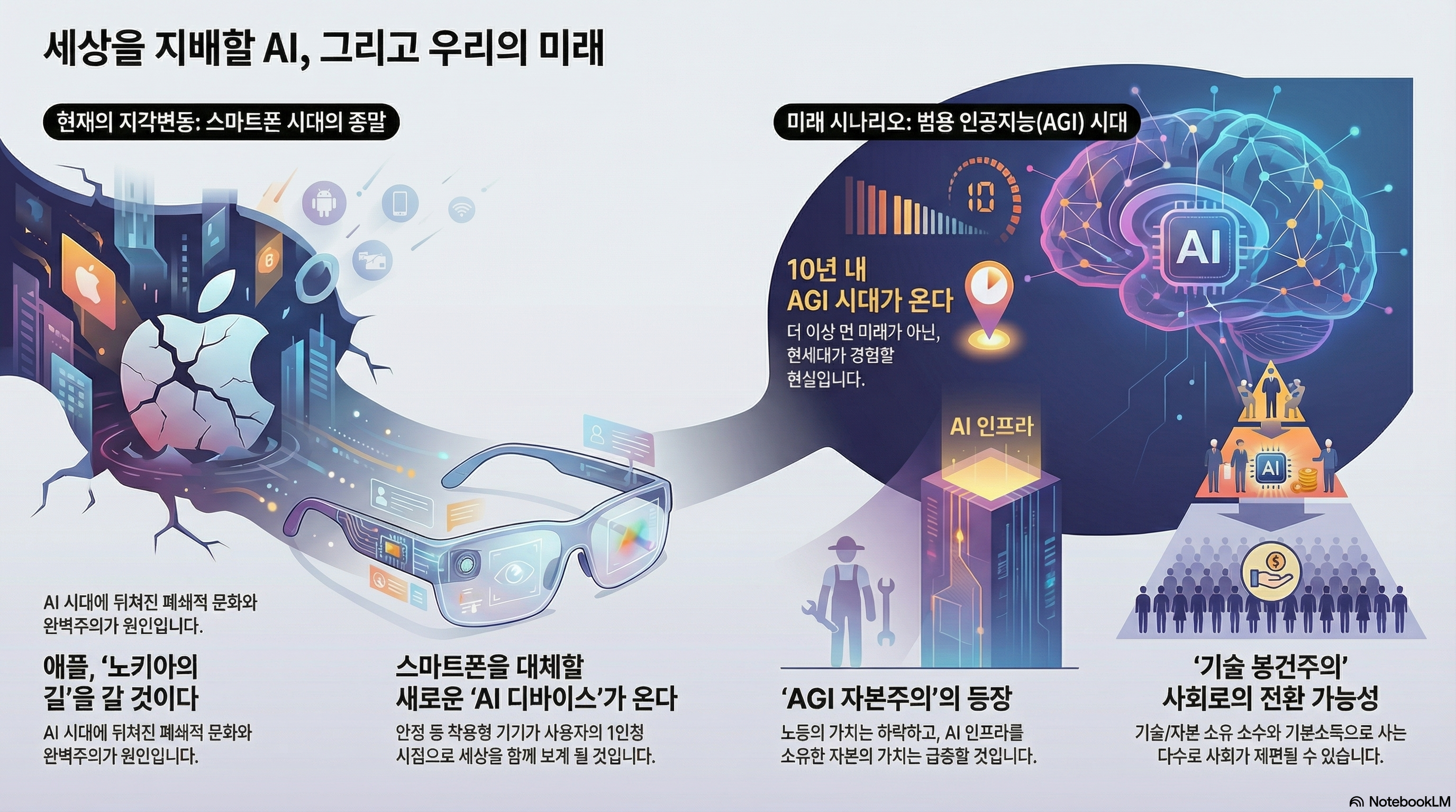 애플의 몰락, 스마트폰의 종말, AGI 시대의 생존 전략, 그리고 기술 봉건주의의 도래까지. 김대식 교수의 예측은 AGI 혁명이 가져올 논리적이고, 어쩌면 피할 수 없는 결과들을 냉정하게 보여줍니다. 이 모든 변화는 더 이상 먼 미래의 일이 아니라, 바로 우리 생애에 경험하게 될 현실입니다.
