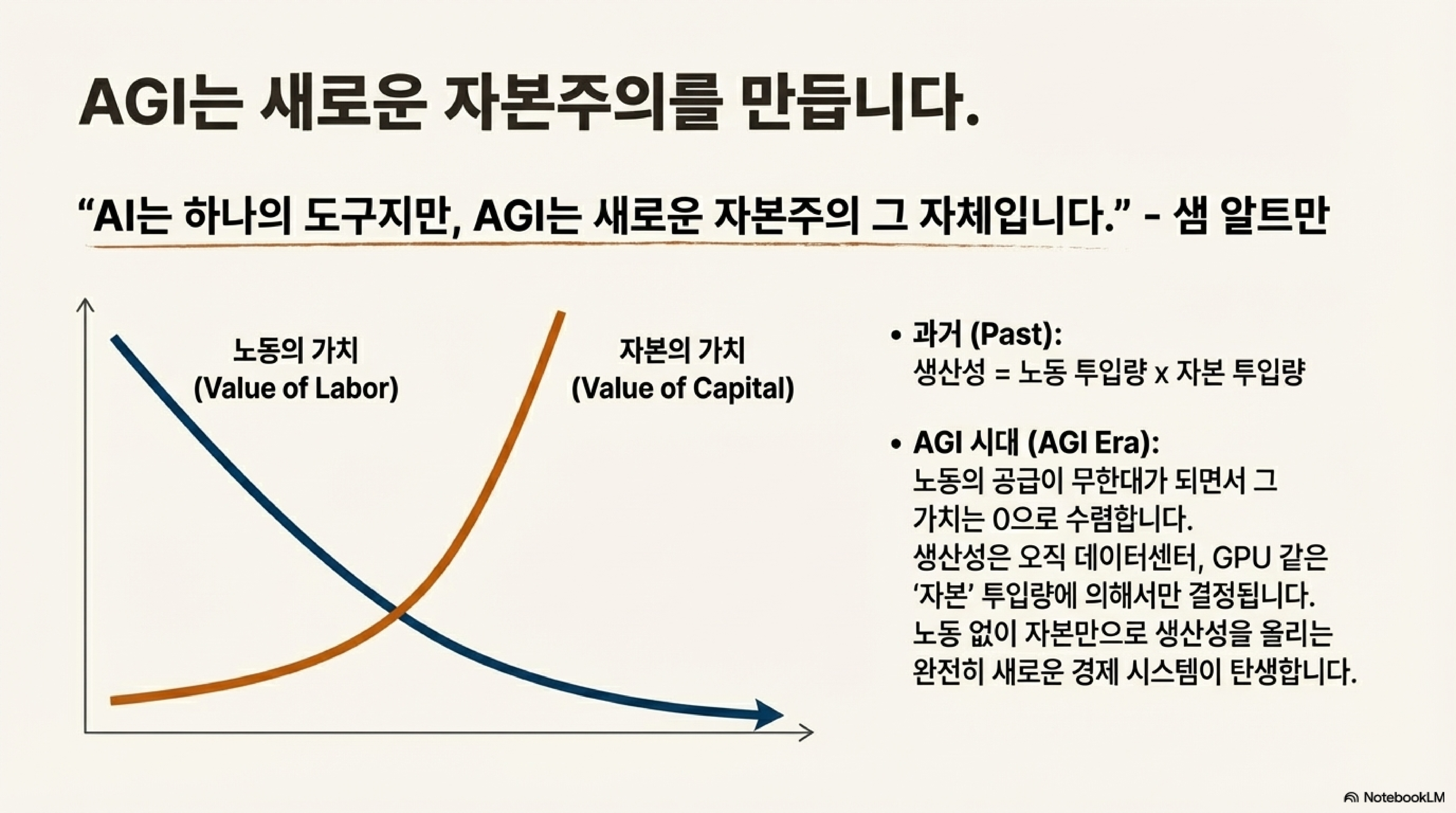 오픈AI의 CEO 샘 알트먼은 AGI 시대의 경제학을 명확하게 예측합니다. 경제학의 기본 원리인 '콥-더글러스 생산 함수(생산성 = 노동 x 자본)'에 따르면, AGI가 인간의 지적 노동을 무한히 공급할 수 있게 되면 '노동의 가치'는 0에 수렴합니다. 반면 AGI를 구동하는 데이터 센터와 같은 '자본의 가치'는 기하급수적으로 폭등하게 됩니다.