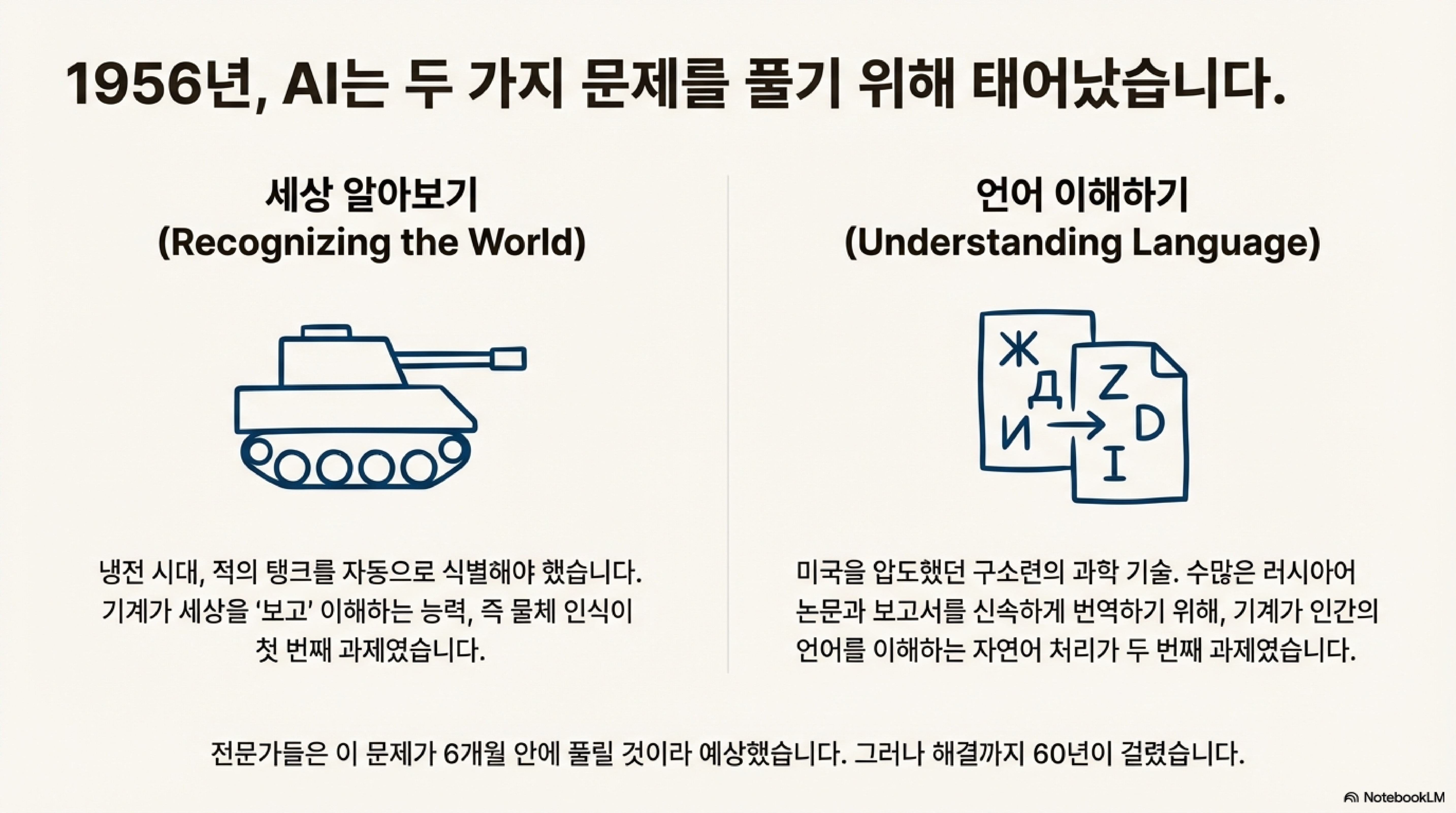 우리가 아는 AI 혁명은 사실상 성공적인 '리브랜딩'에서 시작되었다는 흥미로운 비하인드 스토리가 있습니다. 1956년, 냉전 시대에 AI라는 개념이 처음 등장했을 때 목표는 명확했습니다. 소련 탱크를 자동으로 식별하고, 러시아 과학 논문을 실시간으로 번역하는 것이었습니다. 전문가들은 이 문제가 6개월이면 해결될 것이라 자신했지만, 실제로는 60년이 걸렸습니다.