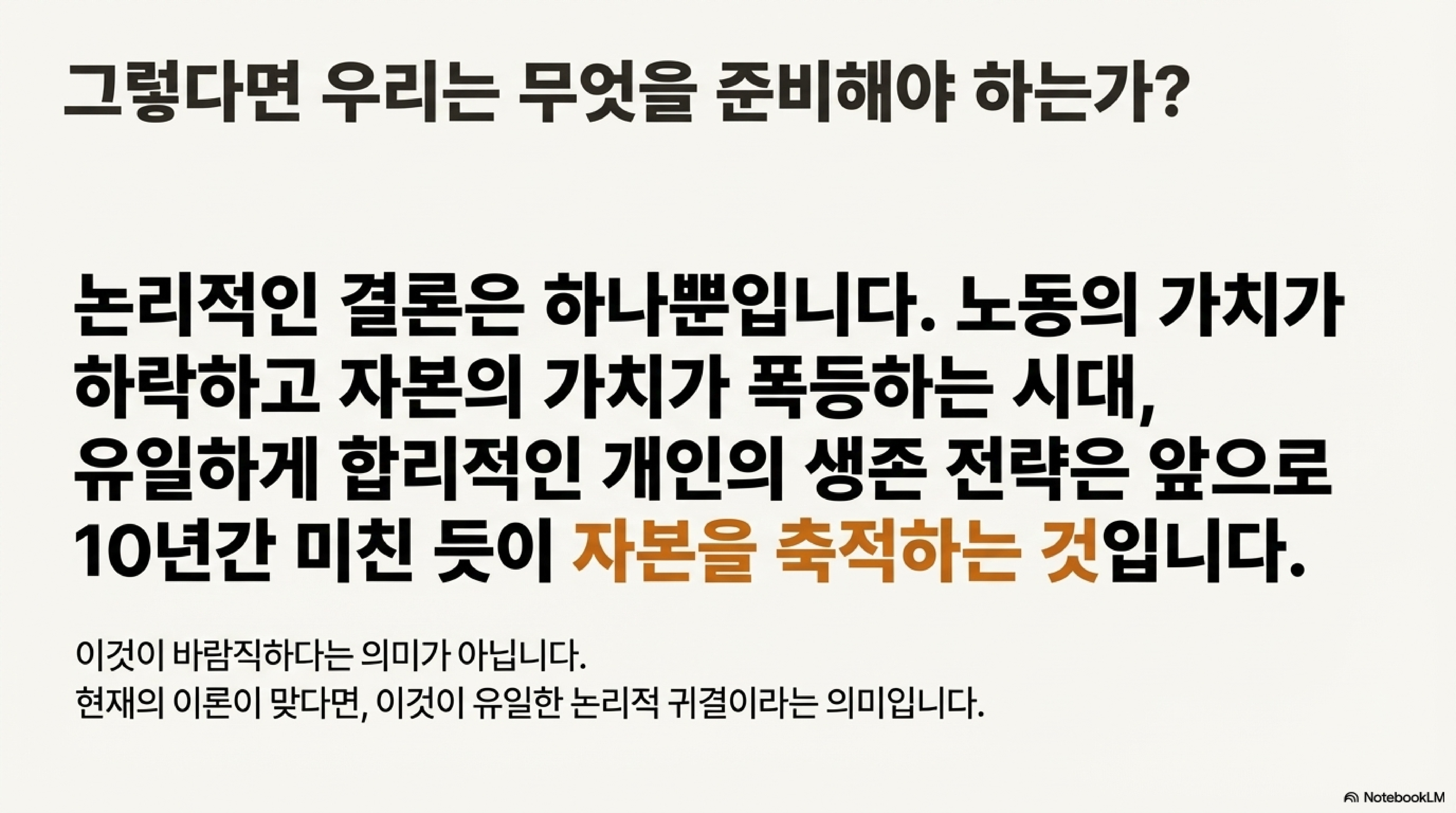 이 냉정한 분석에 기반해 김대식 교수는 개인 차원의 유일한 생존 전략을 제시합니다. 바로 "향후 10년간 미친듯이 돈을 벌어 자본을 축적해야 한다"는 것입니다. 이는 윤리적 판단이 아닌, AGI 시대의 경제 법칙에 따른 순수한 논리적 귀결입니다.