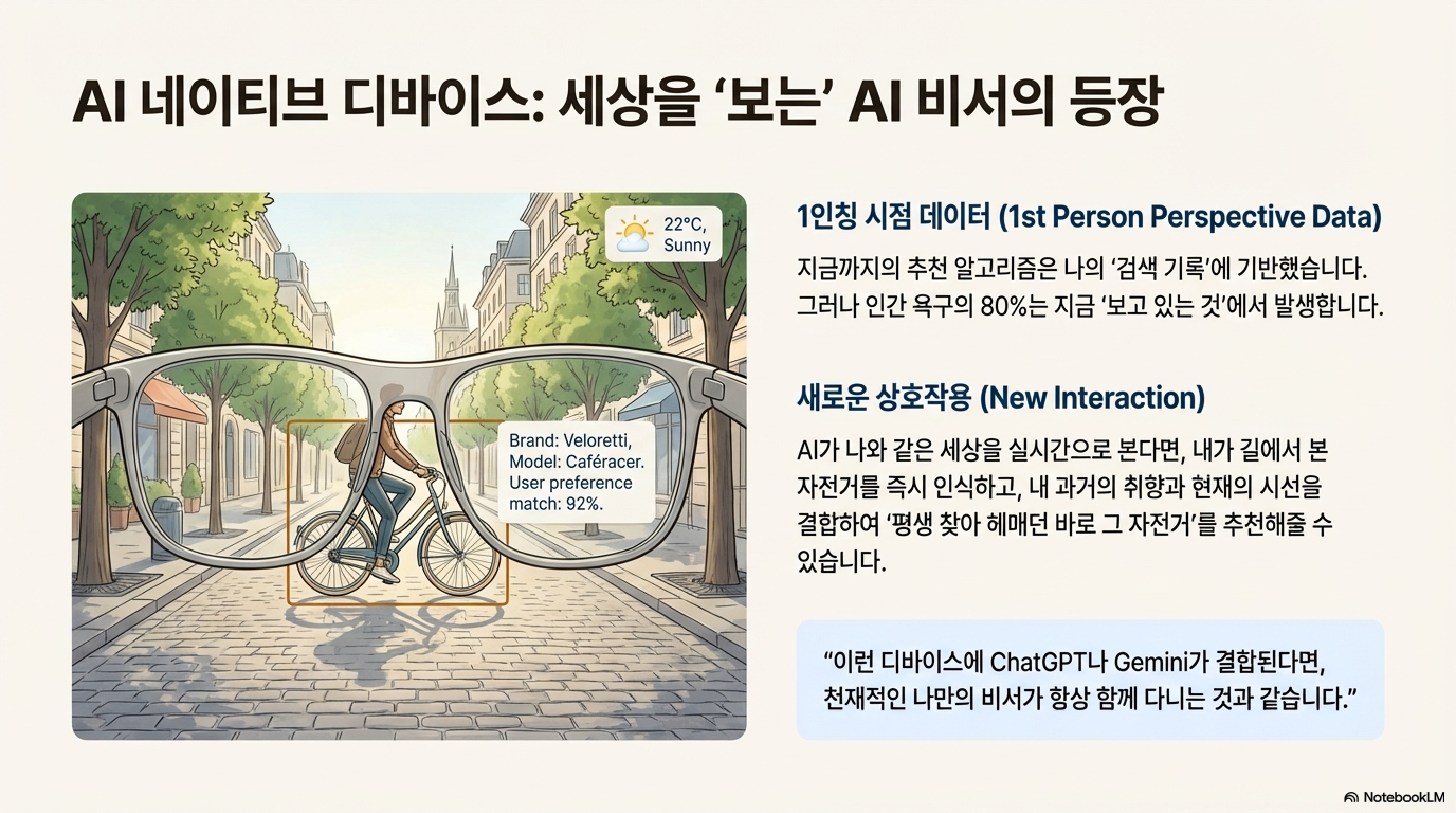 이 1인칭 시점 공유는 추천 알고리즘을 근본적으로 뒤바꿀 것입니다. 지금까지의 추천은 당신의 '검색 기록'이라는 과거 데이터에 의존했습니다. 하지만 미래의 AI는 당신이 지금 '보고 경험하는 것'을 직접 분석합니다. 길을 걷다 멋진 재킷을 보는 순간, AI는 당신의 시선을 통해 욕구를 파악하고 즉시 정보를 제공할 것입니다. 이는 과거의 어떤 추천 기술과도 비교할 수 없는, 상상을 초월할 정도로 정확한 니즈 예측을 가능하게 합니다.