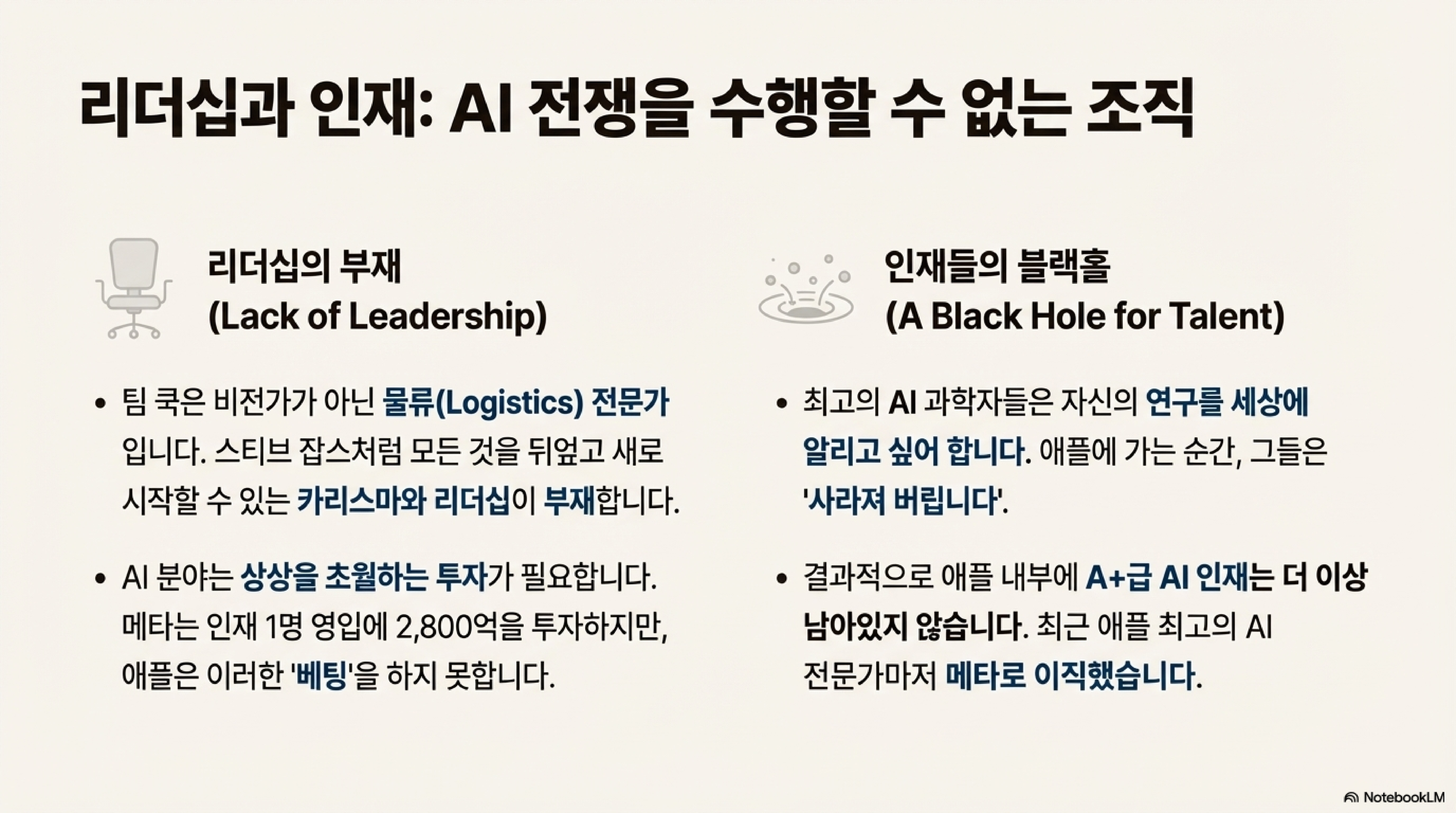 - 리더십의 한계: DNA를 바꿀 수 없는 리더 이런 근본적인 문제를 해결하려면 스티브 잡스처럼 회사의 DNA 자체를 뒤엎는 강력한 리더십이 필요합니다. 하지만 현재의 리더십은 새로운 비전을 제시하기보다 기존의 성공 공식을 유지하는 데 특화되어 있습니다. 경쟁사들이 한 명의 인재에 수천억 원의 보너스를 쏟아붓는 속도전을 애플은 따라갈 수 없습니다.