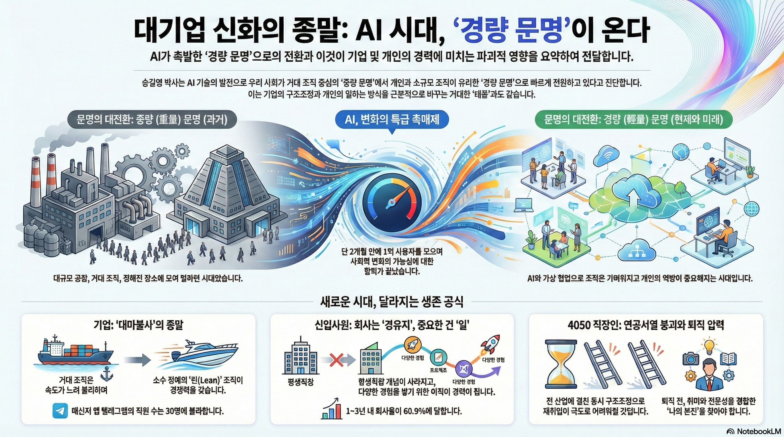 '경량 문명'이 도래하며 기업을 평가하는 기준이 송두리째 바뀌고 있습니다. 과거에는 "10만 명이 뛰고 있습니다"와 같은 인력 규모가 곧 기업의 힘이자 자랑이었습니다. 하지만 '린 AI 리더스 보드(Lean AI Leaders Board)'와 같은 새로운 평가 기준은 이제 소수의 인원으로 막대한 가치를 창출하는 작고 빠른 조직을 주목합니다. 메신저 앱 '텔레그램'의 직원은 단 30명에 불과하며, 1인 개발 기업 '베이스 424'는 1,000억 원에 매각되기도 했습니다.