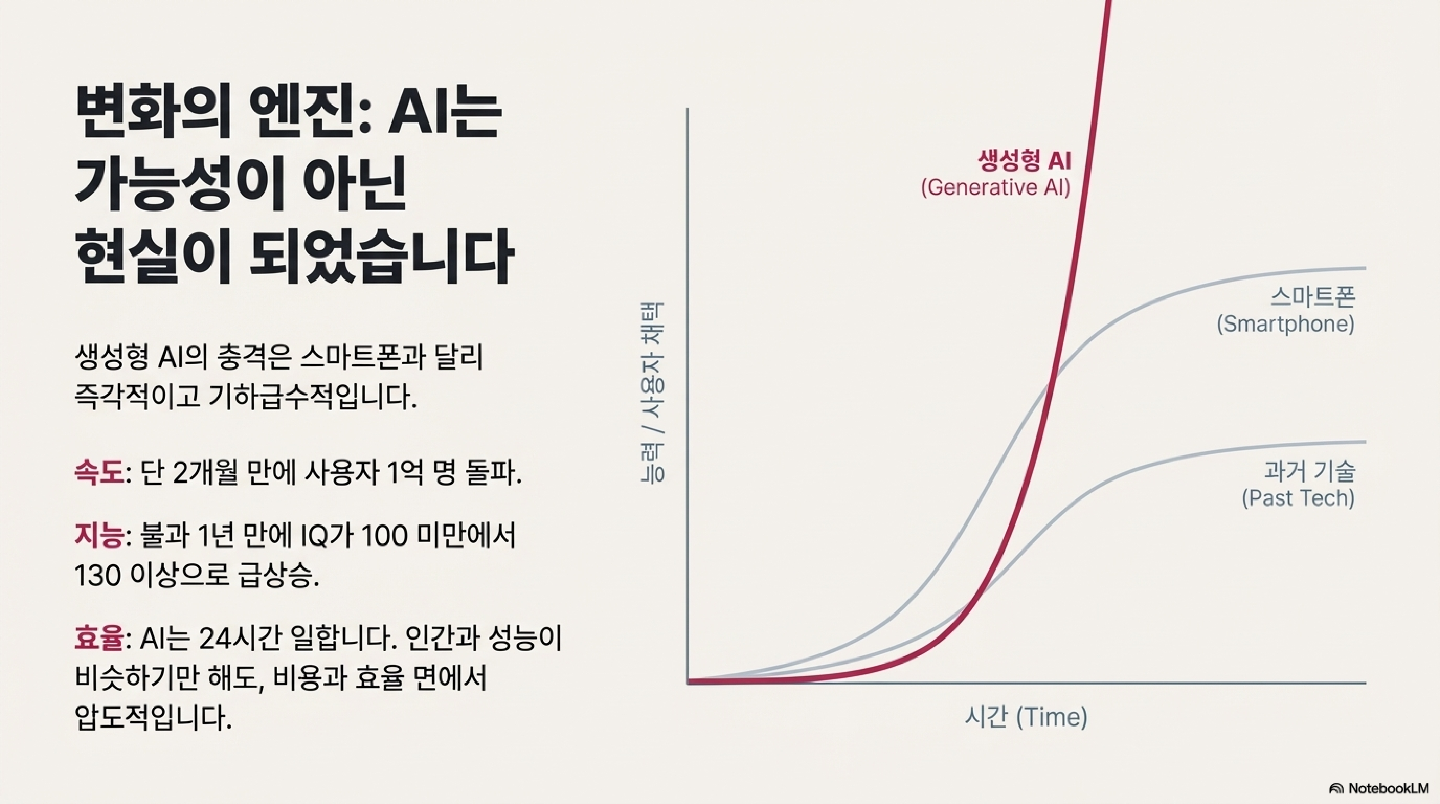지금 우리가 겪는 변화는 일시적인 유행이 아니라 피할 수 없는 문명의 대전환입니다. 흥미로운 점은, 우리를 위협하는 바로 그 기술이 우리에게 새로운 기회를 열어주고 있다는 사실입니다. AI는 주간 보고서 작성이나 협력사 관리 같은 반복적인 업무를 대신 처리해주기 시작했습니다. 덕분에 우리는 숨 막히는 일상 업무에서 벗어나 약간의 '여유'를 갖게 되었습니다.