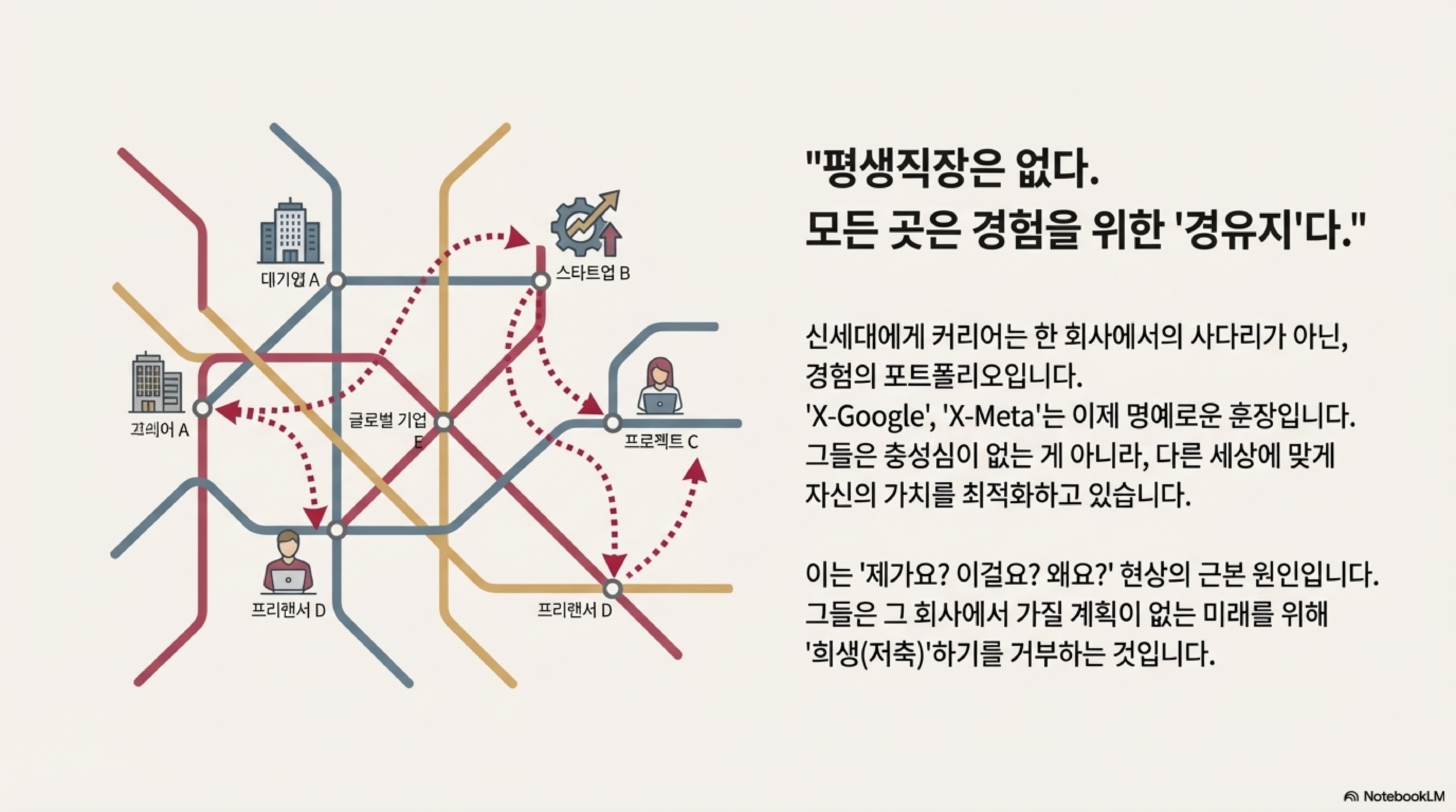 직업에 대한 인식이 '평생을 바치는 곳'에서 '성장을 위한 경험을 쌓는 경유지'로 급격히 변화하고 있습니다. 어렵게 입사한 삼성전자 신입사원들이 줄지어 조기 퇴사하는 현상은 이를 상징적으로 보여줍니다. 오늘날의 인재들에게 한 조직 내에서의 승진은 더 이상 최종 목표가 아닙니다. 그들은 여러 조직을 거치며 'X-구글', 'X-네이버'와 같은 이력을 쌓아 자신의 가치를 높이는 것을 더 중요하게 생각합니다.