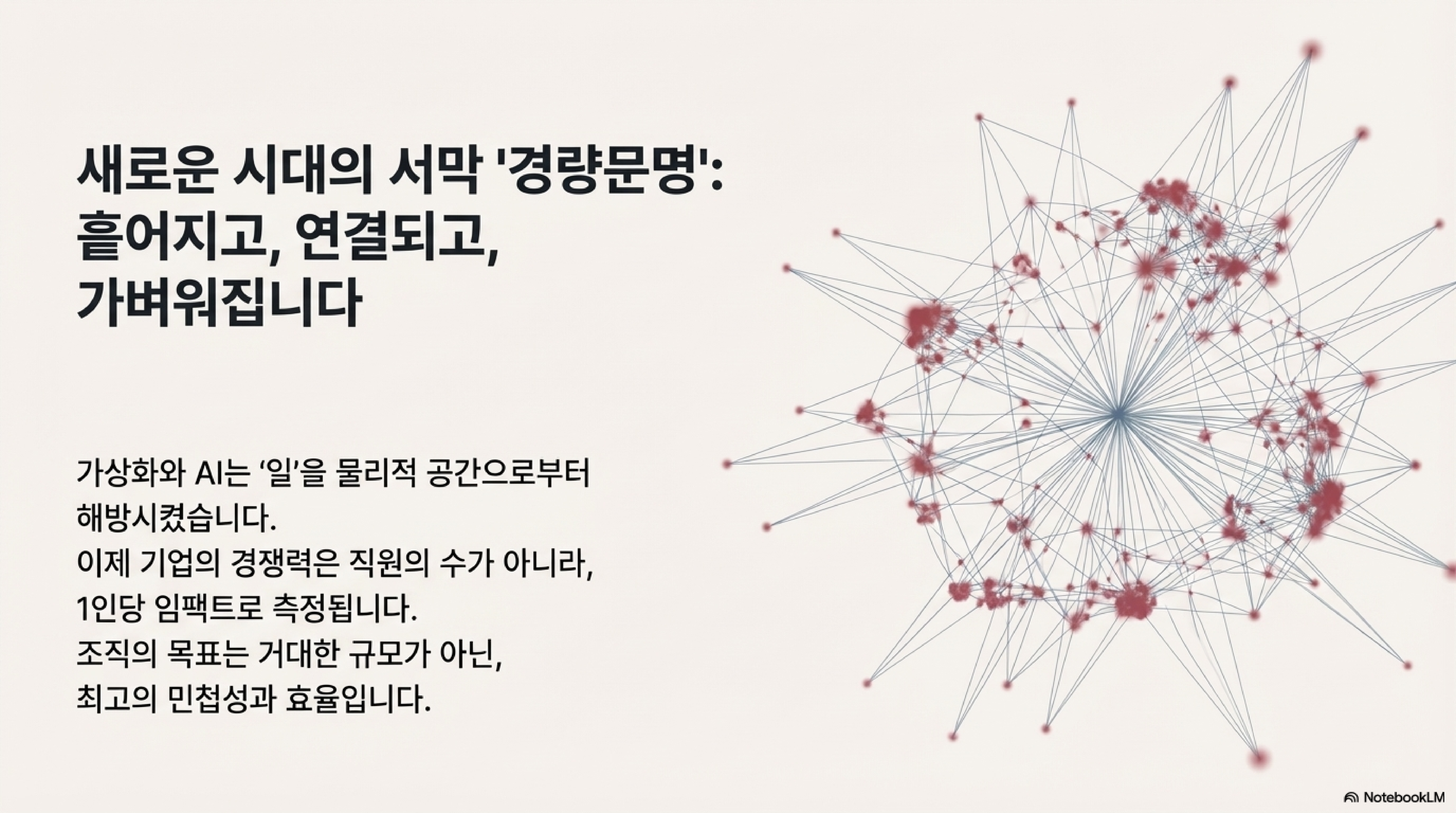 '경량 문명'이 도래하며 기업을 평가하는 기준이 송두리째 바뀌고 있습니다. 과거에는 "10만 명이 뛰고 있습니다"와 같은 인력 규모가 곧 기업의 힘이자 자랑이었습니다. 하지만 '린 AI 리더스 보드(Lean AI Leaders Board)'와 같은 새로운 평가 기준은 이제 소수의 인원으로 막대한 가치를 창출하는 작고 빠른 조직을 주목합니다. 메신저 앱 '텔레그램'의 직원은 단 30명에 불과하며, 1인 개발 기업 '베이스 424'는 1,000억 원에 매각되기도 했습니다.